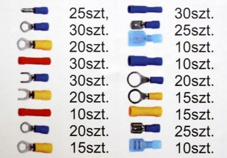 - В комплект входят, среди прочего, изолированные разъемы, гильзы, надеваемые рукава, петелька, цилиндрическая, вилка, соединитель.
