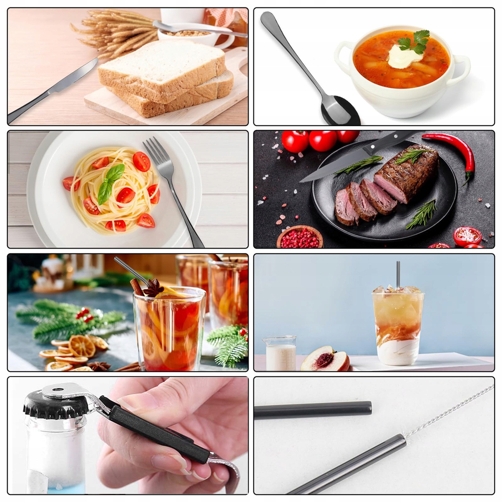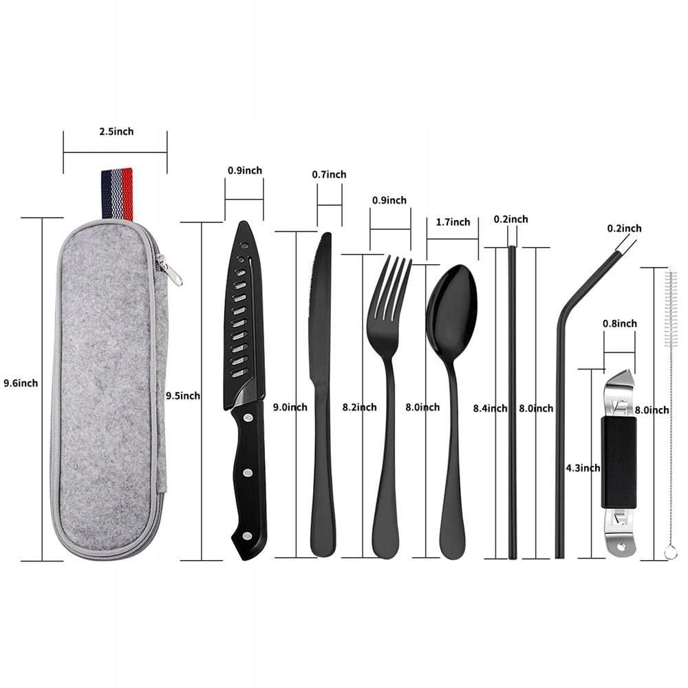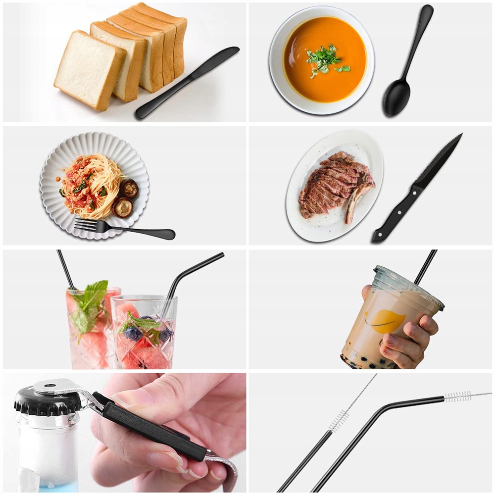 🍴 【9-часовой набор кемпинга】: Этот набор столовых приборов включает в себя 1 вилку, 1 нож, 1 столовую ложку, 1 прямую солому, 1 изогнутую солому, 1 стейк, 1 открывалка для бутылки, 1 кисть для очистки и 1 упаковка столовых приборов.