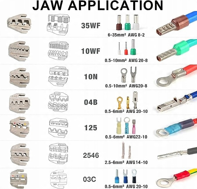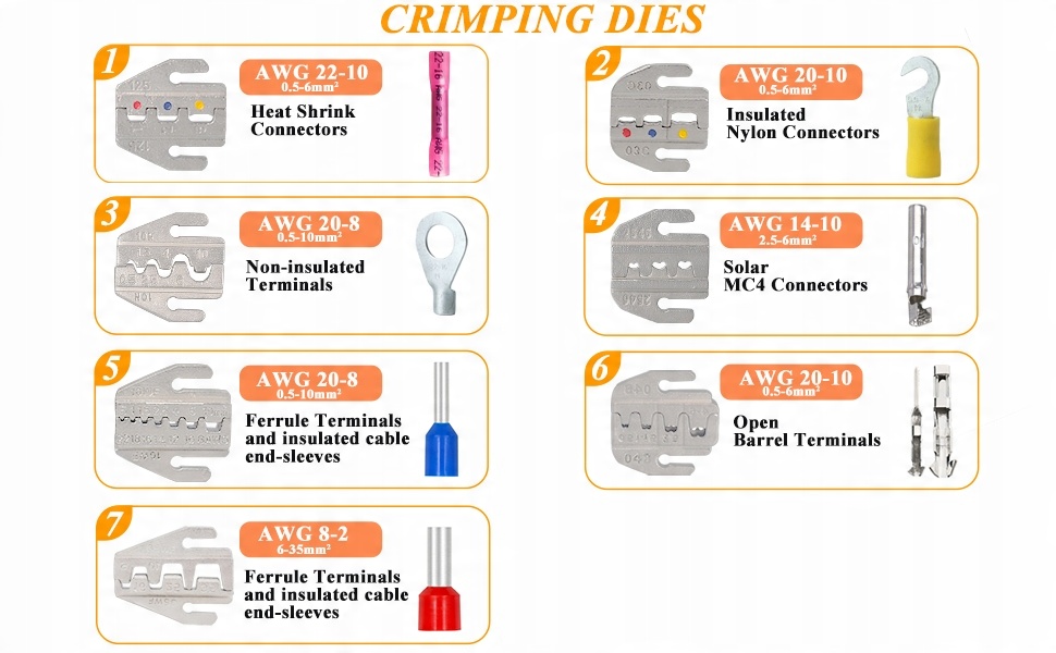Обжимные устройства для проводов с храповым механизмом 35WF и обжимные матрицы 10WF для изолированных и неизолированные наконечники10N обжимная матрица для неизолированных клемм UT&OT04B обжимная матрица для изолированных плоских разъемов и разъемов JST125 обжимная матрица для термоусадочных разъемов03C обжимная матрица для изолированных нейлоновых клемм2546B обжимная матрица для MC4 sPrecision 2 съемника