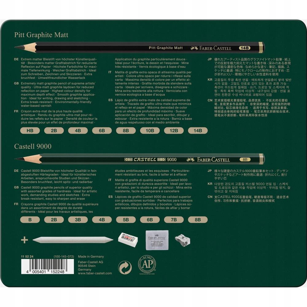 В набор входят: 8 карандашей Pitt Graphite Matt с уровнями твердости: HB, 2B, 4B, 6B, 8B, 10B, 12B и 14B, 8 карандашей Castell 9000 с уровнями твердости B, 2B, 3B, 4B, 5B, 6B. , 7Б, 8Б, вешалка для бумаги, ластик, художественный ластик для хлеба и металлическая точилка.