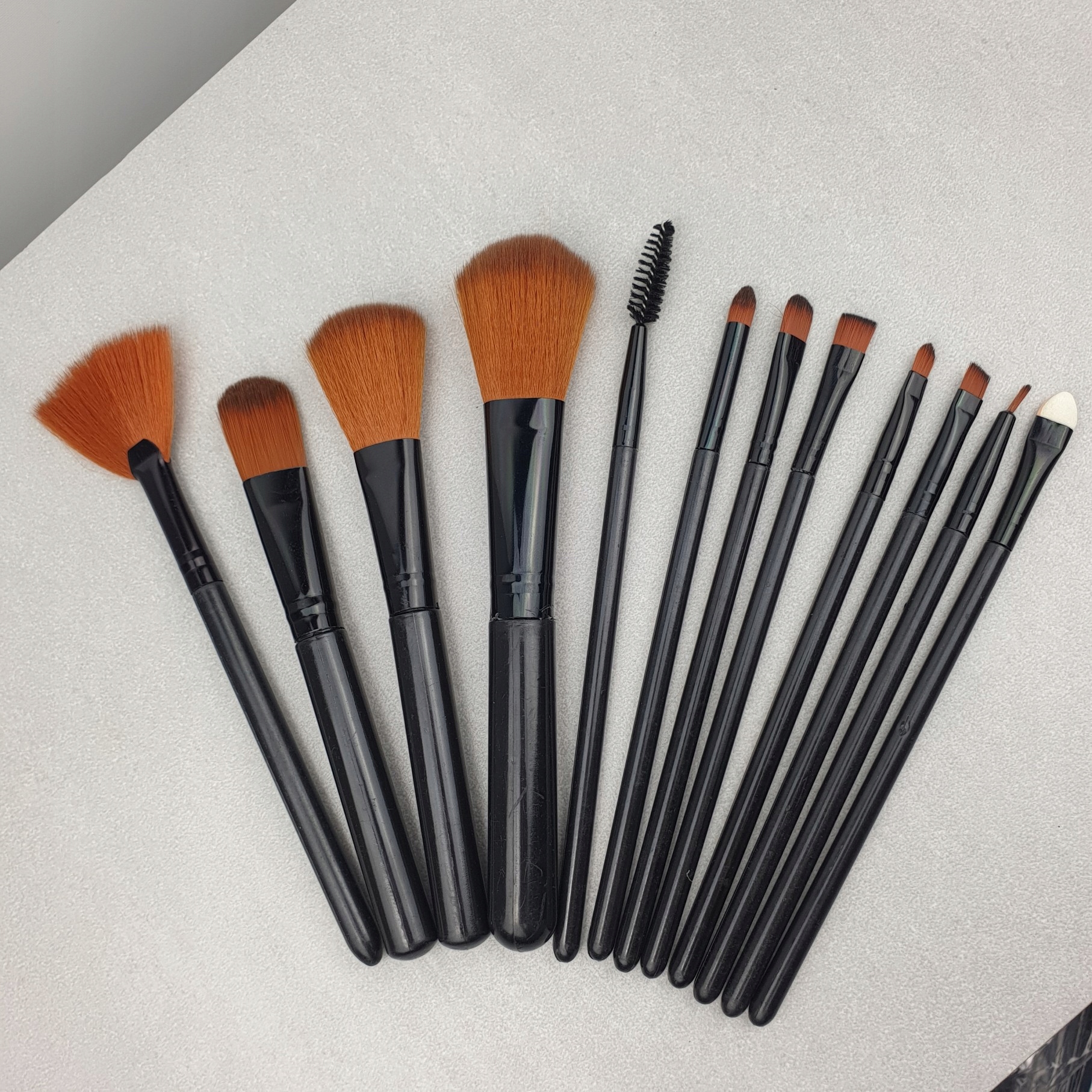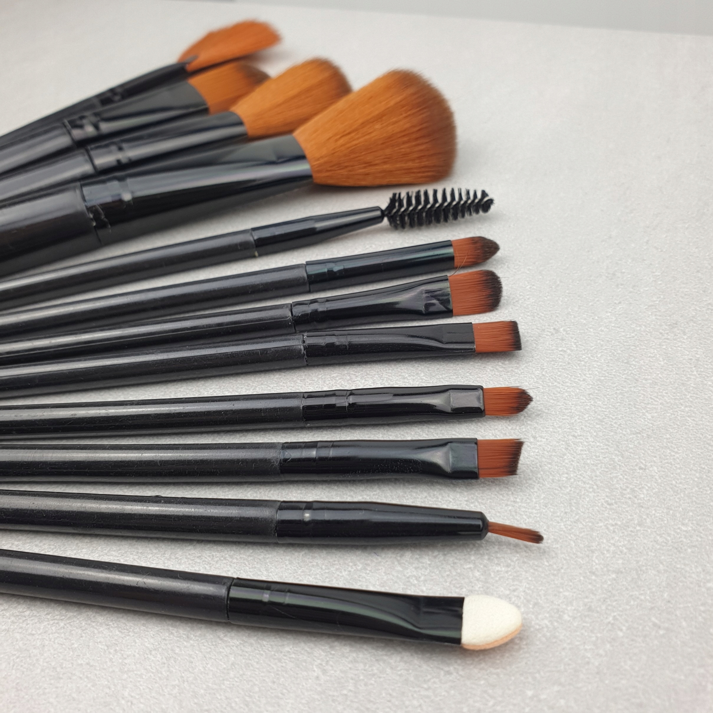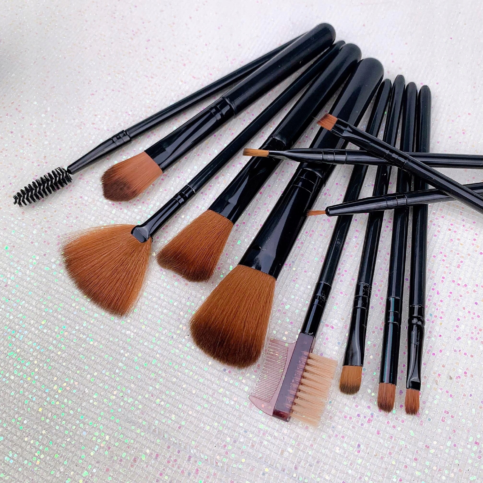 В наборе 12 различных кистей для макияжа лица и глаз.