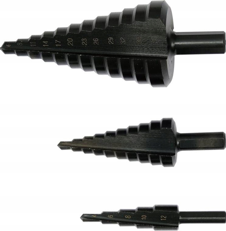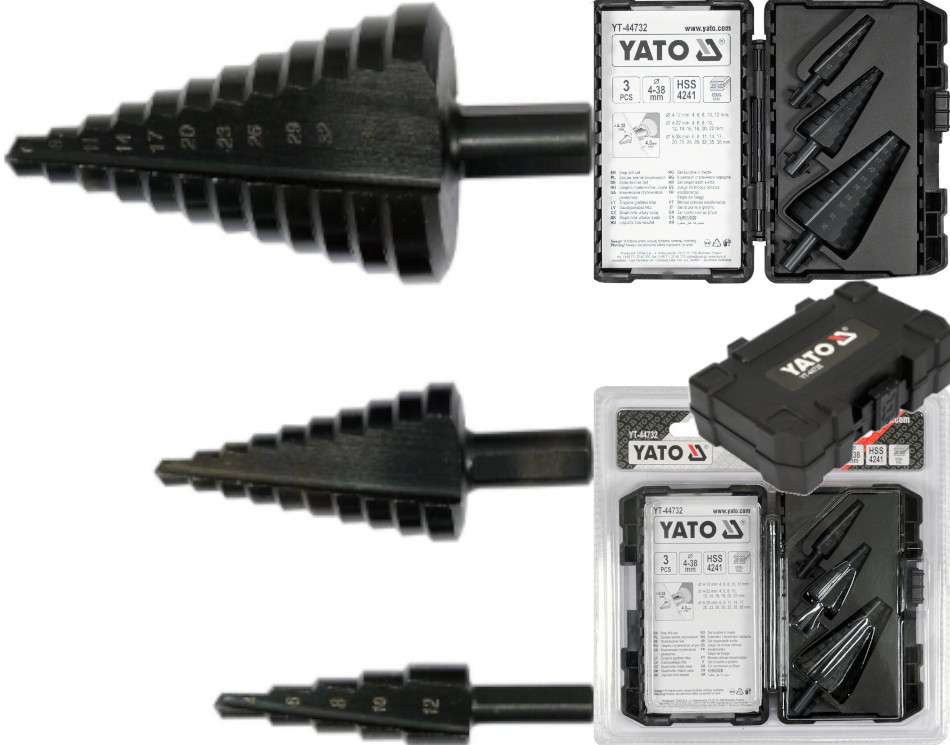 набор из трех постепенных упражнений yato для бурения в высококачественной из нержавеющей стали, конструкционной стали, холодной свертываемой стали, цветных металлов, стальных листов и пластика. 8, 10, 12 мм), рабочая длина 43 мм, общая длина 64 мм; (6, 8, 11, 14, 17, 20, 23, 26, 29, 32, 35, 38 мм), рабочая длина 76 мм, общая длина 100 мм; Цилиндрический с тремя плоскими поверхностями ; Толщина: 4 мм;