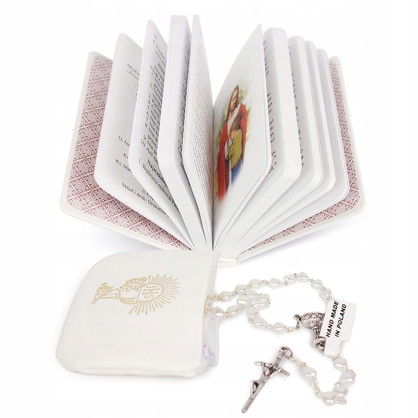 Молитва в твердой, белой, содержит ряд молитв, подготовку к священному причастию, песням и услугам. Буклет оснащен лентой, которая позволяет отметить страницу. Большой, разборчивый шрифт. Печать в цветах: черный и красный облегчает использование буклета. Молитвенная книга также содержит несколько красочных иллюстраций в детском стиле.