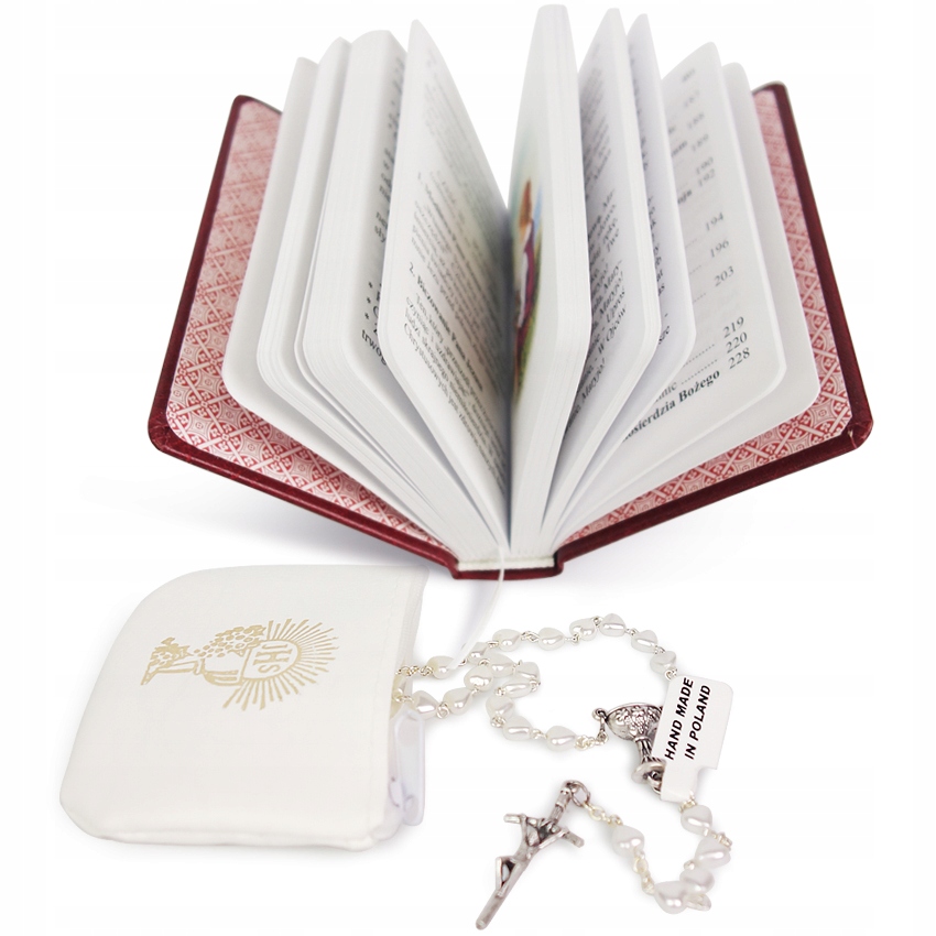 Молитва в жесткой, бордовой, содержит ряд молитв, подготовку к священному причастию, песням и услугам. Буклет, оснащенный лентой, которая позволяет выбрать страницу. Большой, разборчивый шрифт. Печать в цветах: черный и красный облегчает использование буклета. Молитвенная книга также содержит несколько красочных иллюстраций в детском стиле.