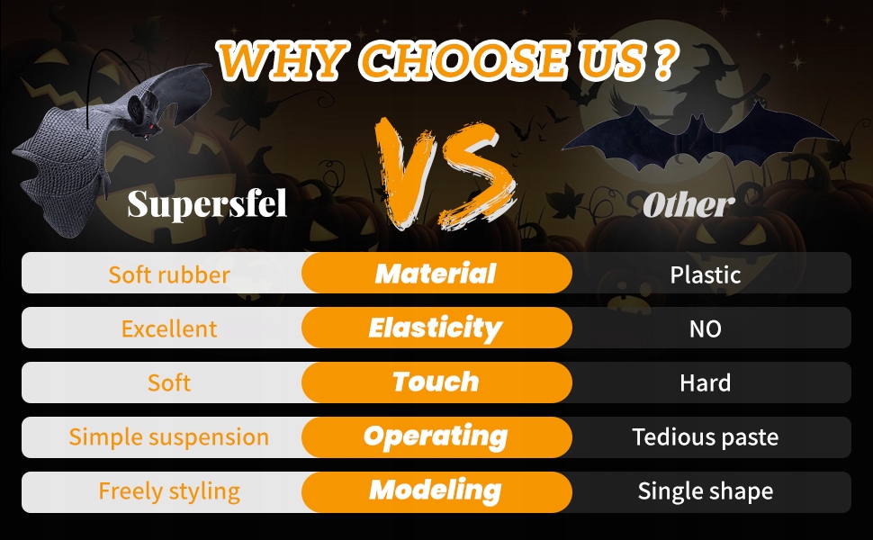 - Возможность приостановить, повторно использовать каждый год: вы можете повесить эти висящие летучих мышей на Хэллоуин на стенах, дверях, окнах, ткани, дереве или в других местах, чтобы добавить ужасную атмосферу, чтобы украсить вечеринку в Хэллоуине. Украшение летучих мышей для Хэллоуина, сделанное из прочного материала, может быть подвешено в течение длительного времени, и вы можете использовать его снова с любым Хэллоуином. Идеальное обязательство для украшения Хэллоуина