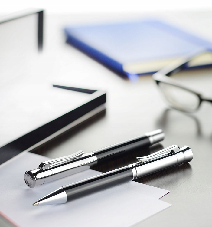 В набор для письма входит металлическая ручка, элегантная шариковая ручка и белый футляр из эко-кожи.