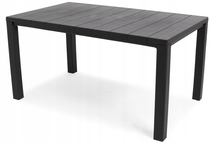 Большая прямоугольная таблица с размерами: 147 x 90 x 74,5 см. Столетняя столешница имеет тонкую текстуру, напоминающую деревянные панели, а ноги стабильны и прекращены анти -славы.