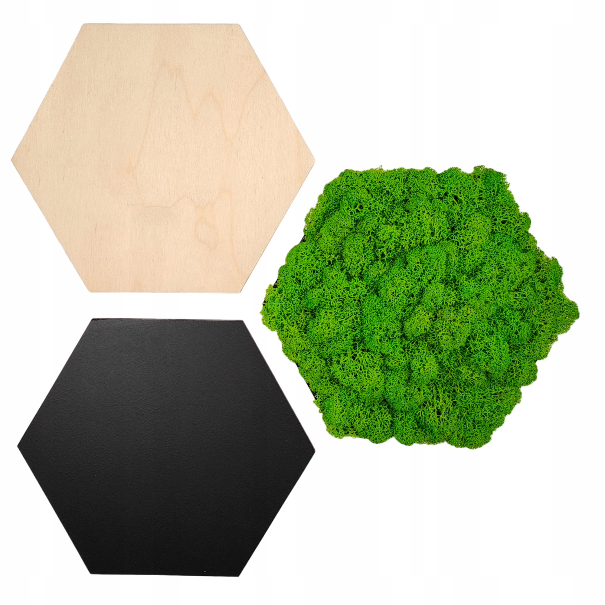 Набор из 9 шестиугольных элементов: 3 шестиугольника из мха, 3 черных шестиугольника, 3 натуральных шестиугольника.