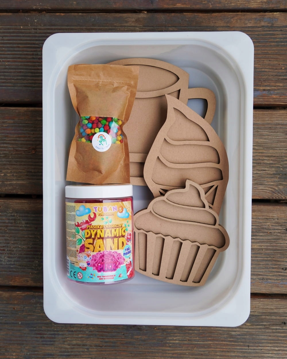 Масса и зерно вливают в контейнер, расположились сенсокартонами и подготовлены, дайте ребенку играть.