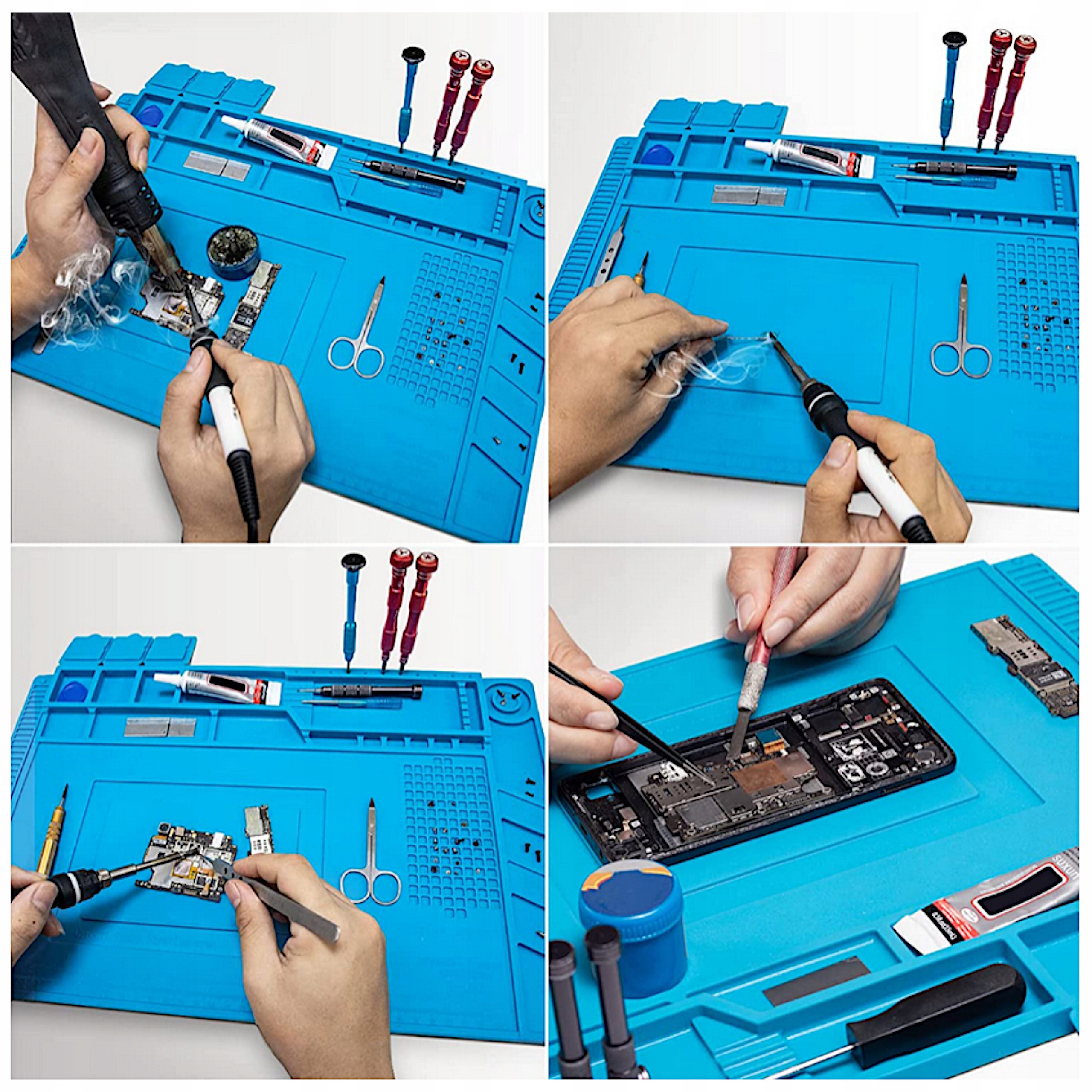 Высококачественный силиконовый коврик с профилированные отсеки, повышающие комфорт работы в каждом сервисе. Антистатические свойства и специальные отсеки позволяют организовать и разделить электронные компоненты, винты и т. д. во время работы. Большая ровная поверхность и высокая термостойкость позволяют паять платы и экраны, размещенные прямо на коврике.