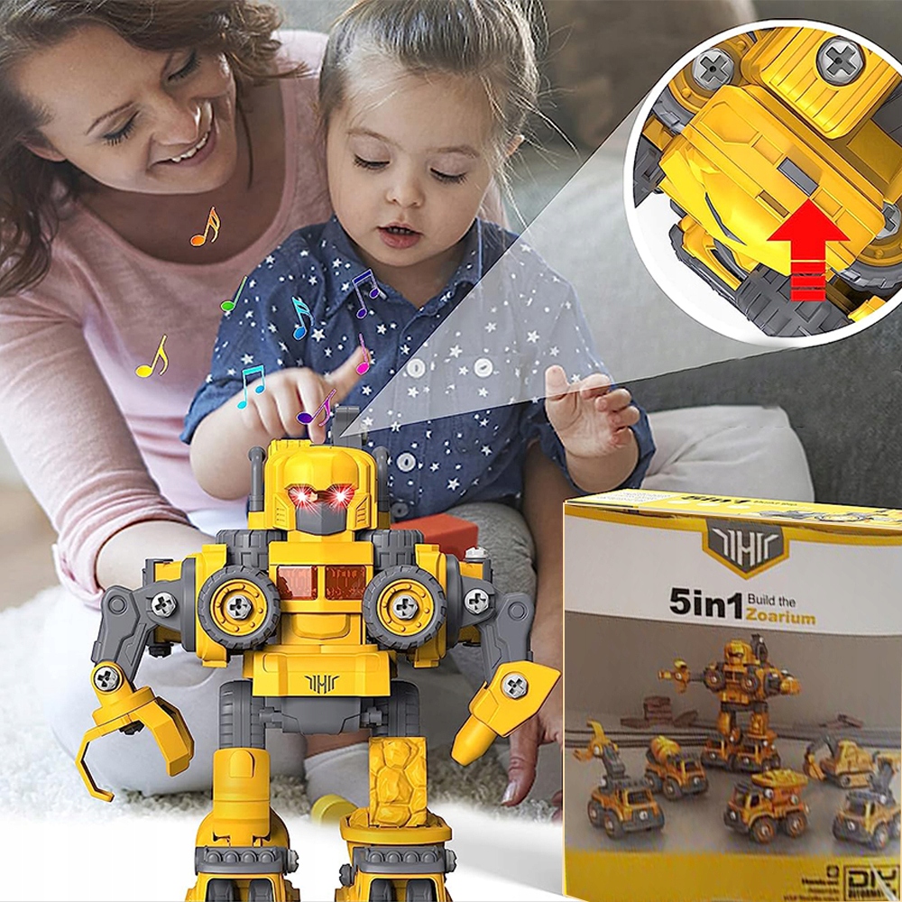 🧩 Набор 5 в 1 —— Оснащен 5 машинами, экскаватором, бетономешалкой, карьерным грузовиком, грейфер для дерева и дрель. Также возможно объединить 5 машин в одного робота.