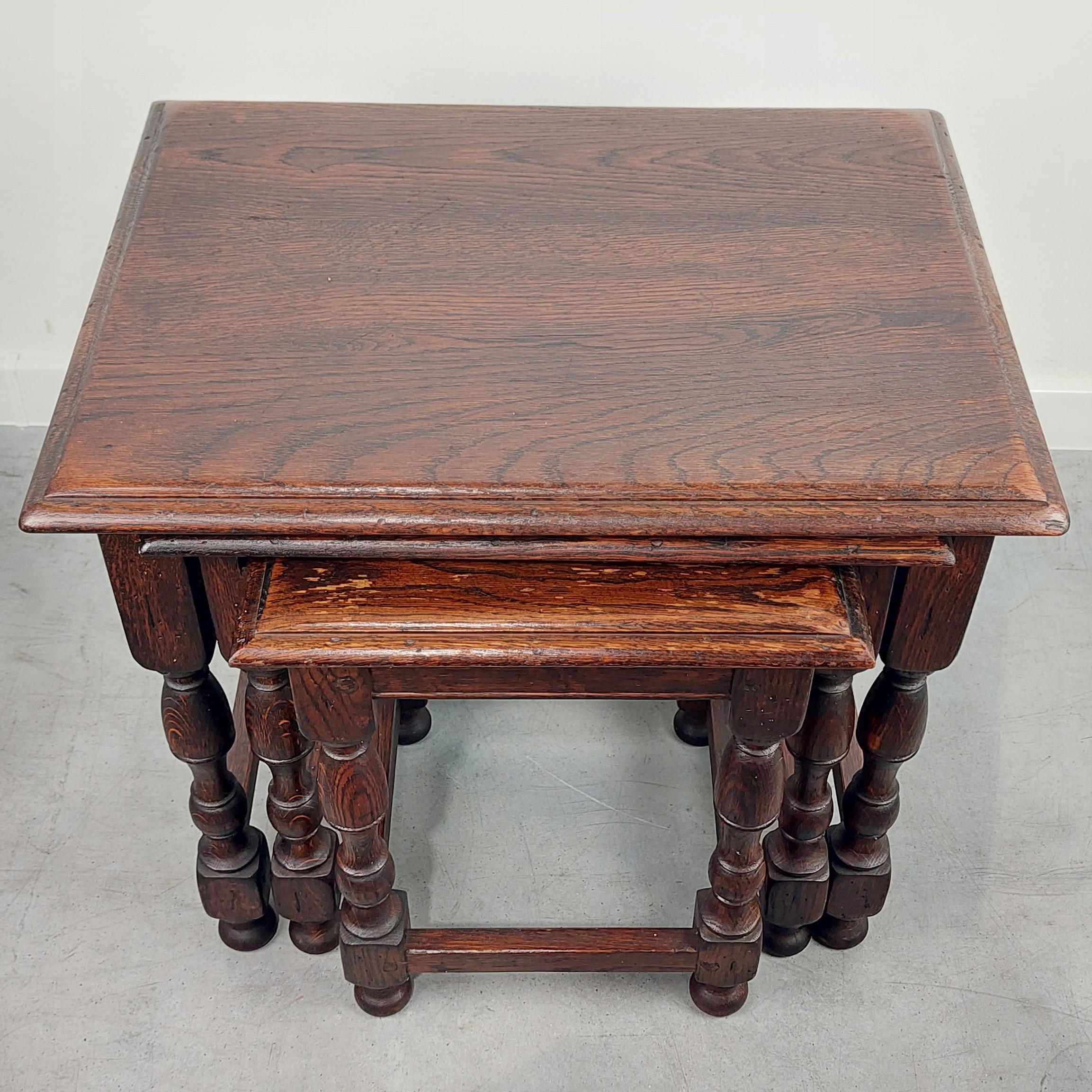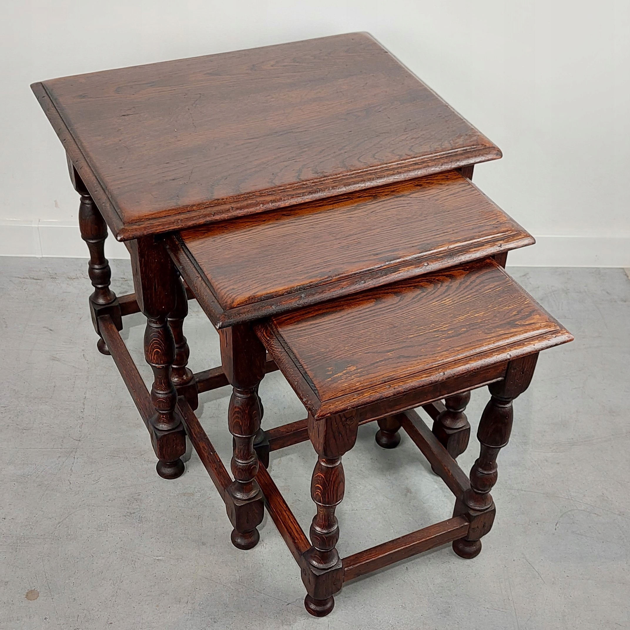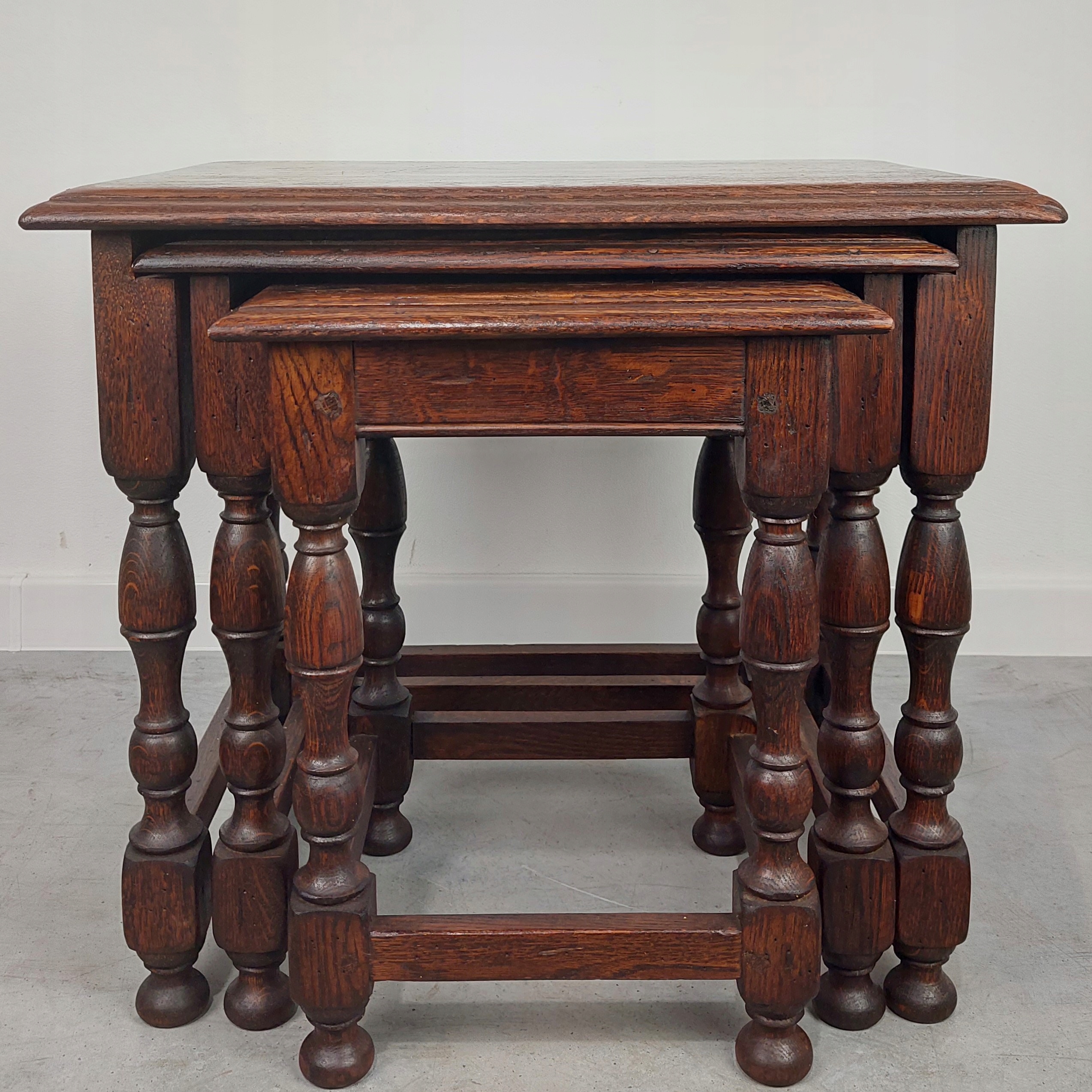 Стильный комплект тройников в колониальном стиле, выполненный из массива дуба. На комплекте присутствуют следы использования: царапины, потертости, а также намеренно нанесенные следы, имитирующие потертость (характерные для колониального стиля). Самый нижний стол не скользит до конца. Подробности показаны на фотографиях ниже.