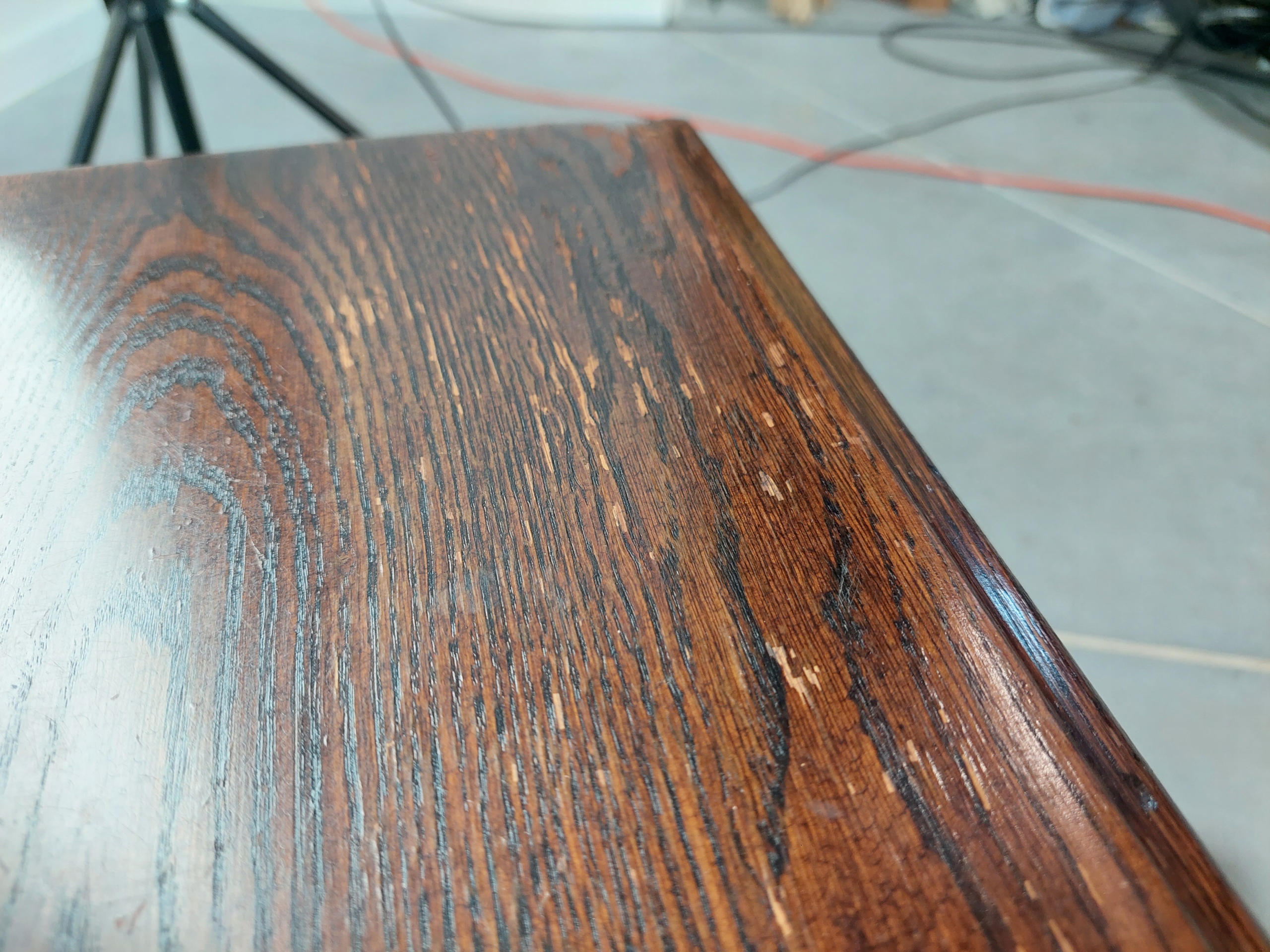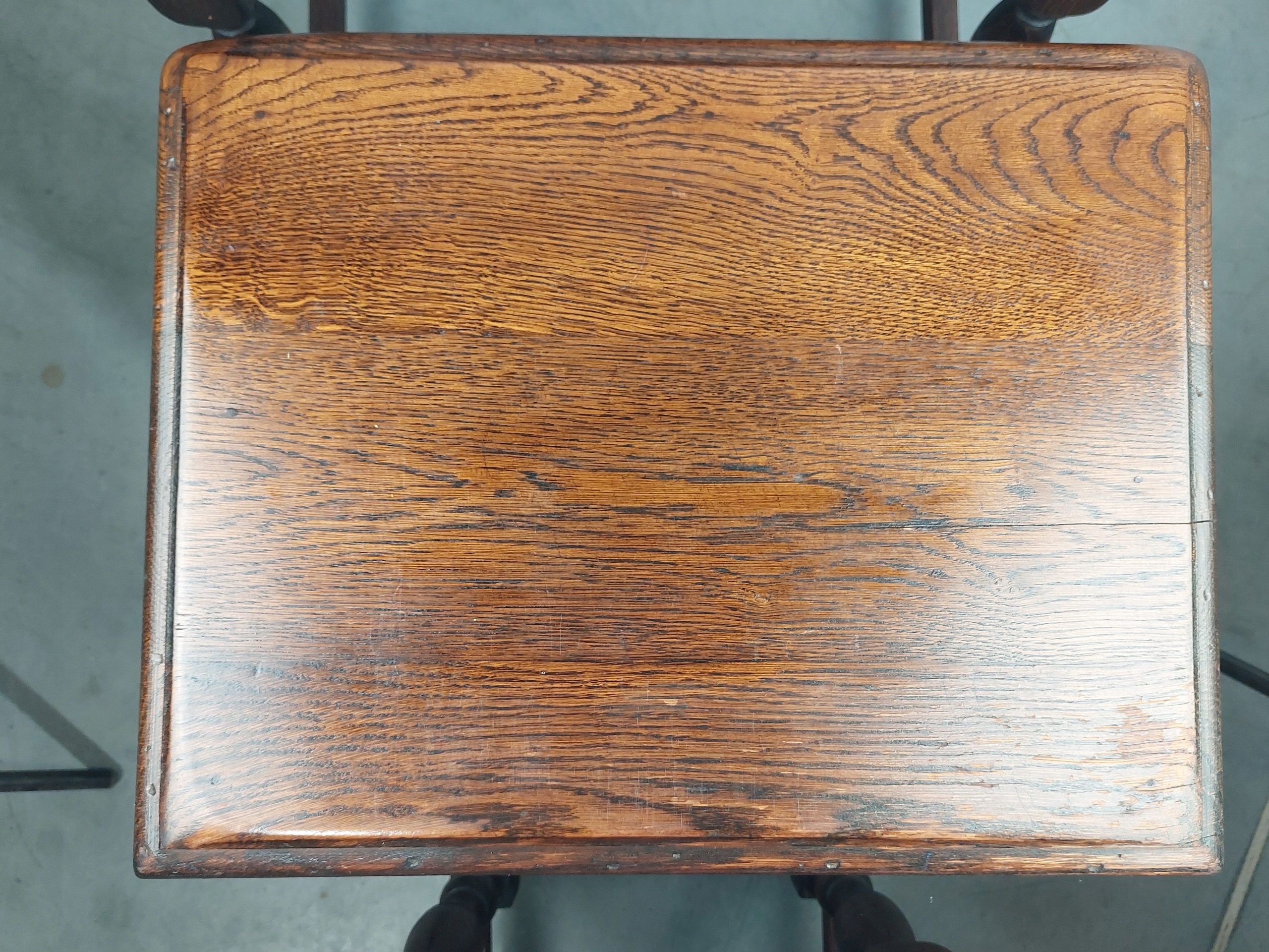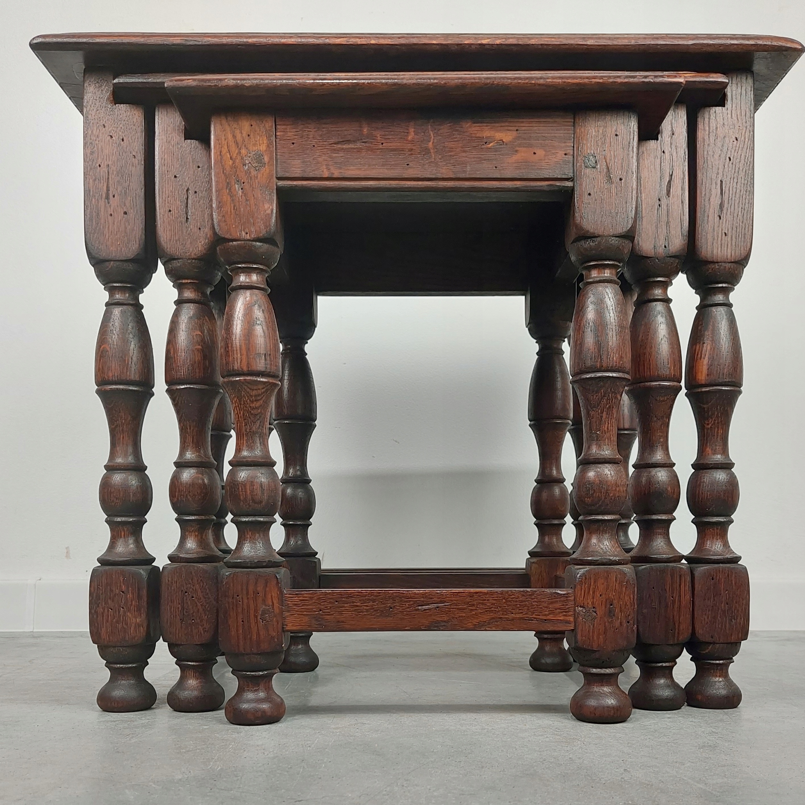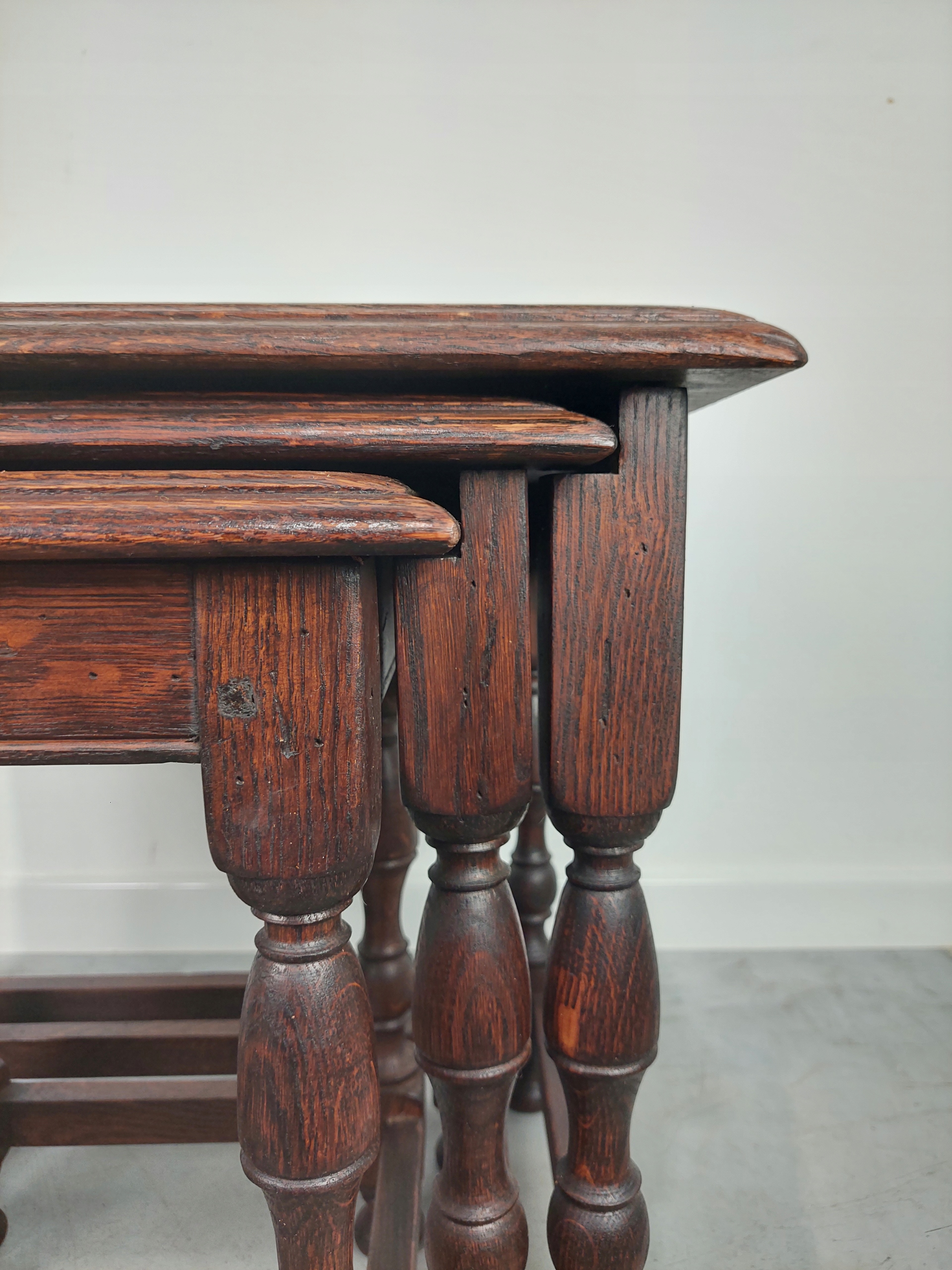 Стильный комплект тройников в колониальном стиле, выполненный из массива дуба. На комплекте присутствуют следы использования: царапины, потертости, а также намеренно нанесенные следы, имитирующие потертость (характерные для колониального стиля). Самый нижний стол не скользит до конца. Подробности показаны на фотографиях ниже.