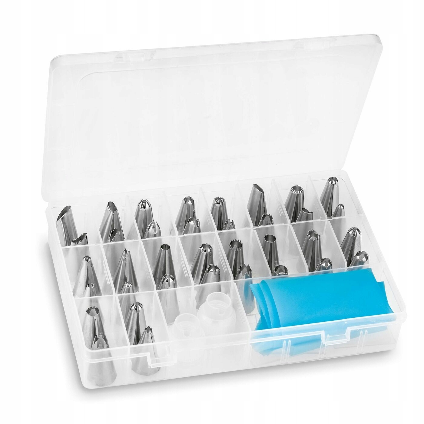 Набор для украшения торта Tadar — силиконовый кондитерский мешок, 2 адаптера и 36 стальных насадок-декораторов — все в специальном органайзере.