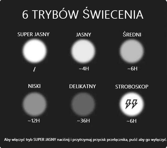 СУПЕР ЯРКИЙ 2000лм (сверхъяркий режим получается только при удержании кнопки) --> ЯРКИЙ 1200лм ( ~4ч) постоянный режим --> СРЕДНЯЯ 720лм (~6ч) --> НИЗКАЯ 240лм (~12ч) --> МЯГКАЯ 60лм (~36ч) --> СТРОБЕСКОП 1200лм (~6ч)