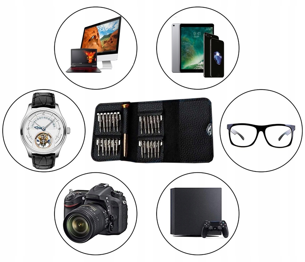 Этот набор инструментов предназначен для ремонта небольших повседневных устройств, таких как телефоны, очки, планшеты, цифровые фотоаппараты и часы.