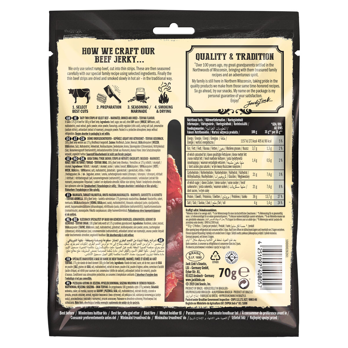 Вяленая говядина Терияки Jack Link's Beef Jerky 70 г — вкусная, высокобелковая закуска > это даст вам большую дозу энергии. Попробуйте нежные кусочки лучшей говядины с характерным сладковатым вкусом, обогащенные вкусным соевым соусом и нотками имбиря, которые придают мясу фруктовый азиатский вкус.