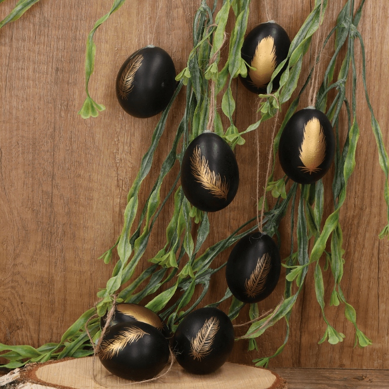 Придайте элегантность своим пасхальным украшениям с помощью набора из 9 подвесок в форме яиц. Выполненные в глубоком черном цвете, украшенные узором из золотых перьев, они выглядят чрезвычайно стильно и современно. Идеально подходит для украшения веток, венков или пасхальных корзин. Благодаря практичным подвескам они удобны в использовании и прекрасно сочетаются с другими элементами декора. Уникальный дизайн подчеркнет характер вашей рождественской композиции и порадует гостей.