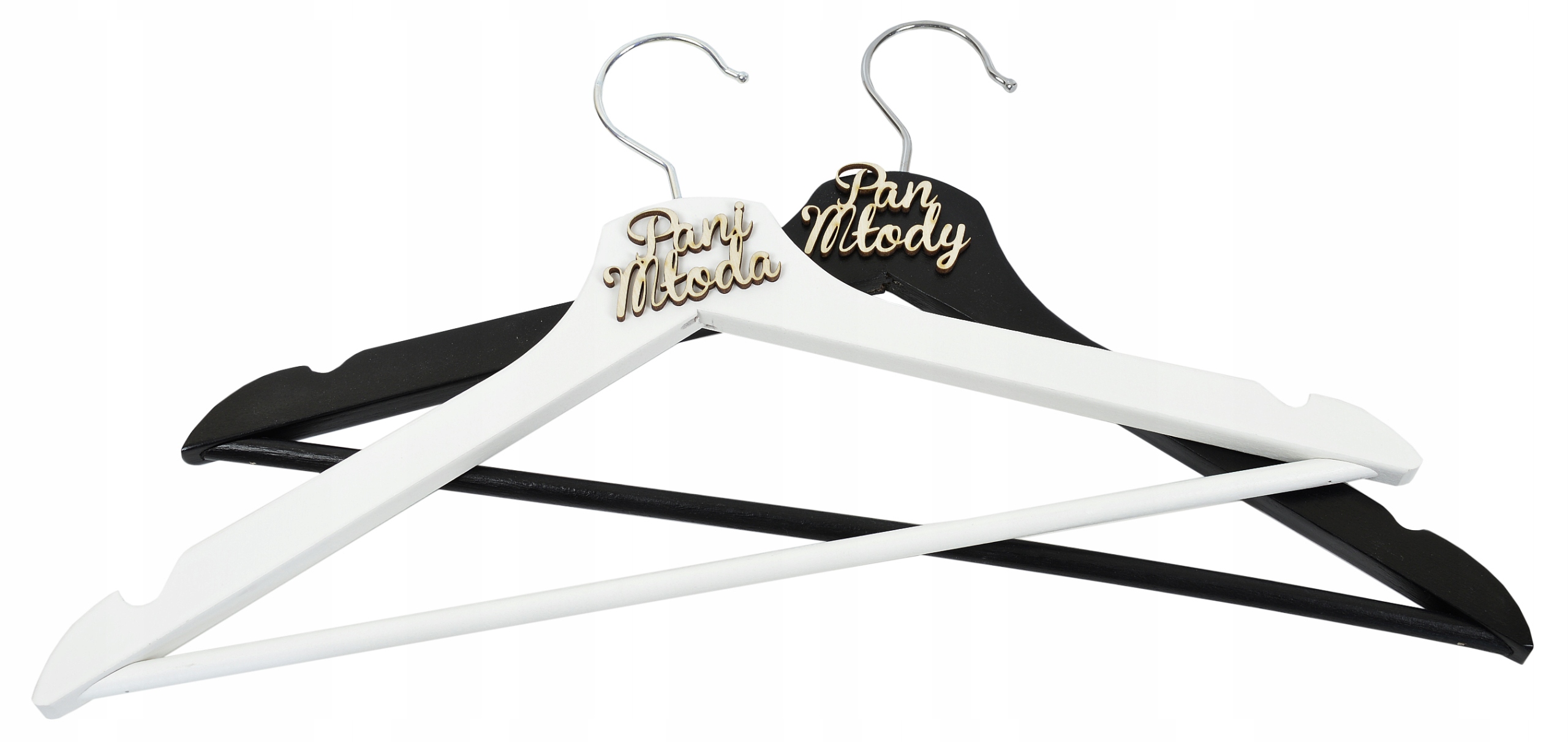 Представляем свадебные вешалки для жениха и невесты. Наш продукт — отличный гаджет, который можно использовать во время фотосессии в этот особенный день. Представленный ниже комплект состоит из двух вешалок черно-белого цвета, с предварительно вырезанной в фанере дополнительной надписью: «Невеста» и «Жених».