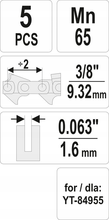 Комплект состоит из 5 комплектных звеньев, предназначенных для обжима режущих цепей для пил по дереву. с шагом 3/8 дюйма (9,32 мм) и шириной 0,063 дюйма (1,6 мм).
