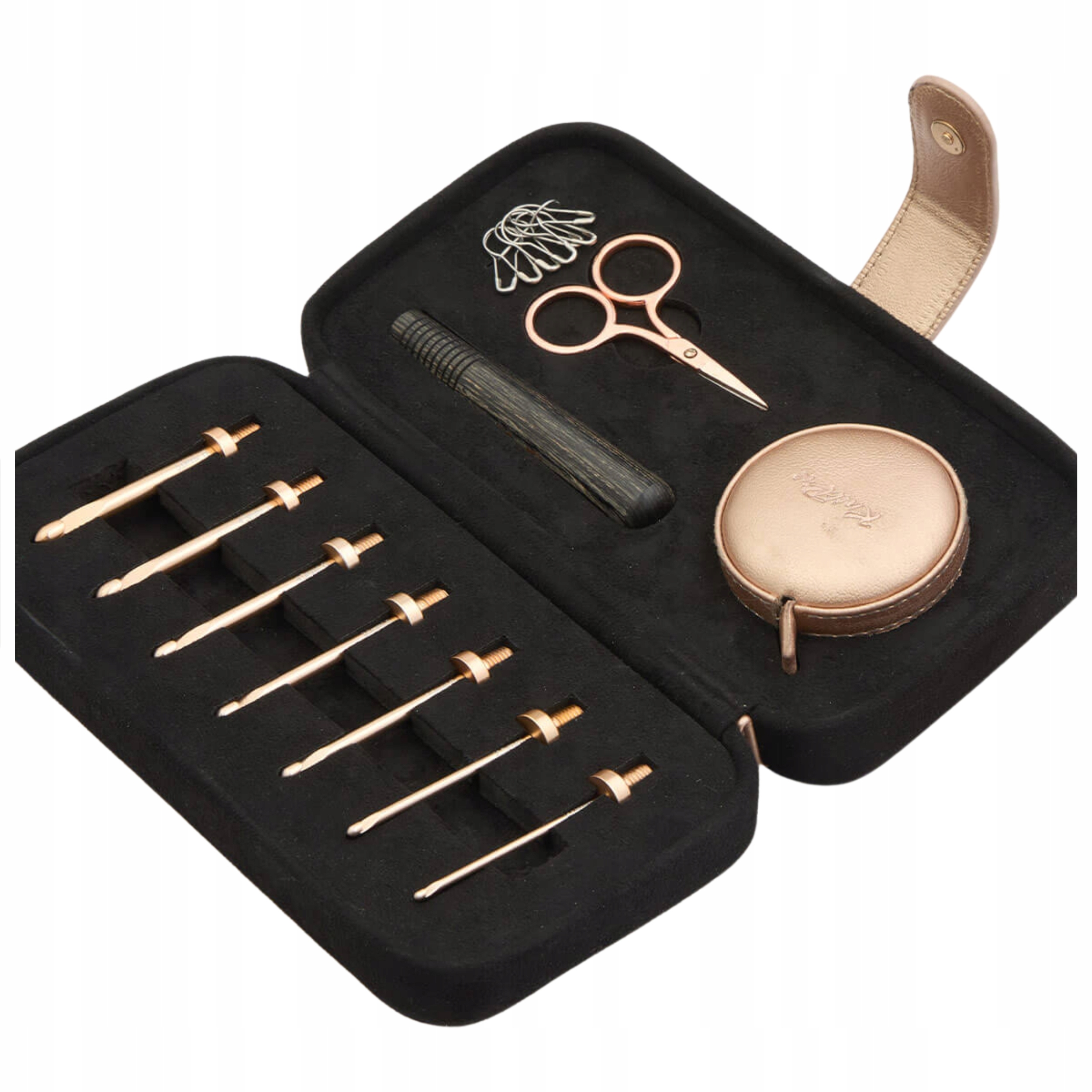 STARTER OASIS SET идеально подходит для начинающих и опытных людей. Удовлетворяя потребности каждого, а набор содержит 7 взаимозаменяемых вязаных крючков в размерах от 2,0 до 5,0 мм. Универсальный металлический вязаный крючок в оттенке розового золота идеально сочетается с деревянной ручкой в сером ониксе. Крючков и ручка, сопровождаемая удобной измерительной чашкой, 10 металлическими маркерами для блокировки швов и ножниц, тщательно заказаны в черном (угольном) материале, идеально подходят для путешествий и хранения