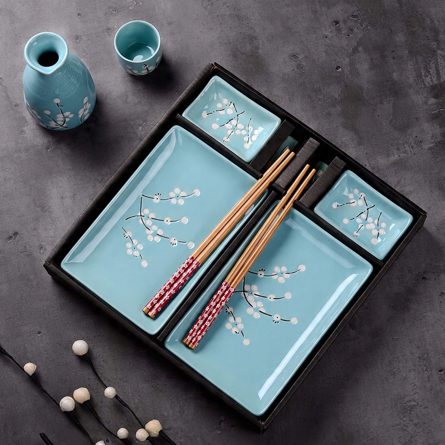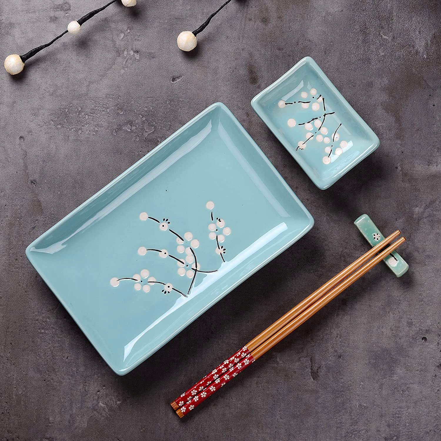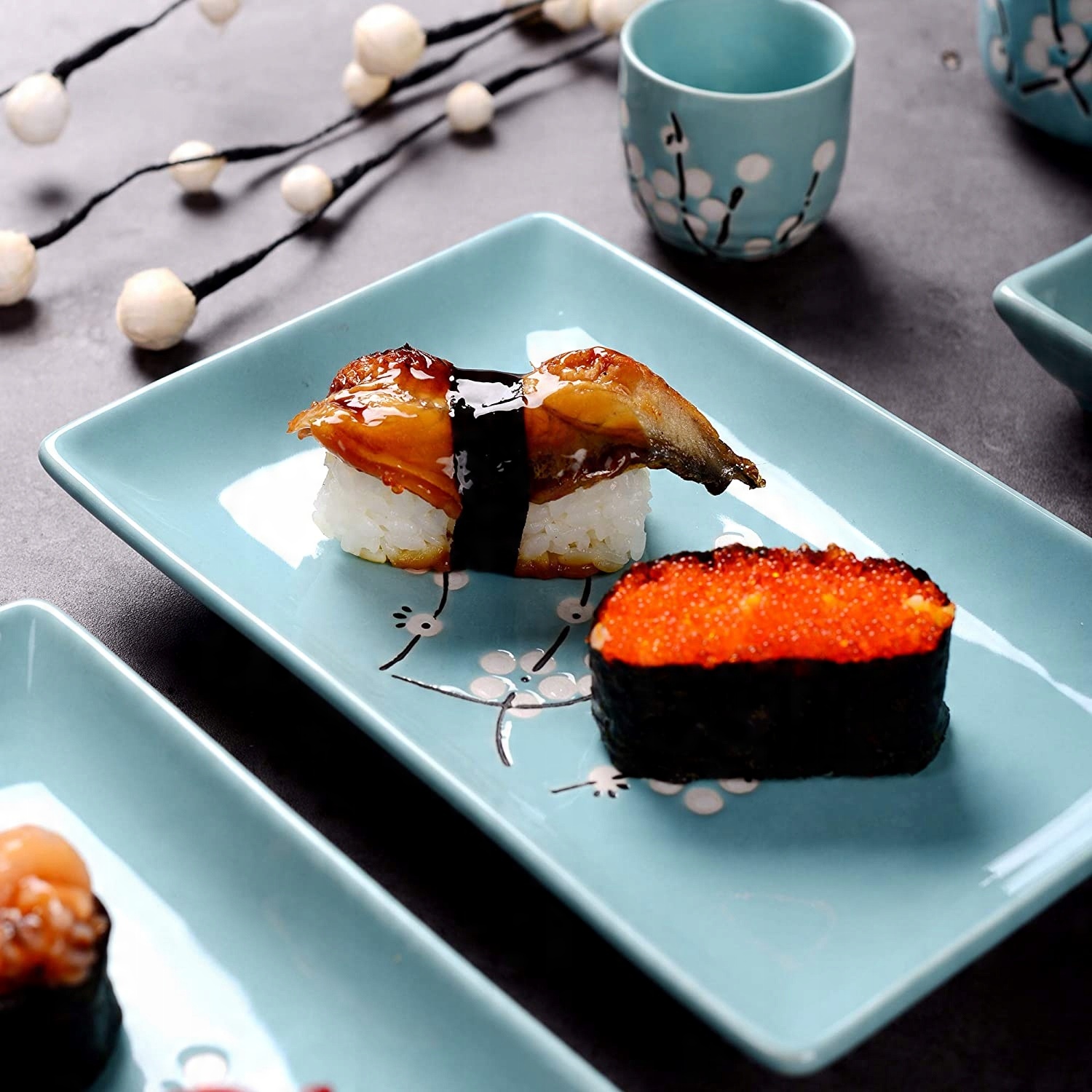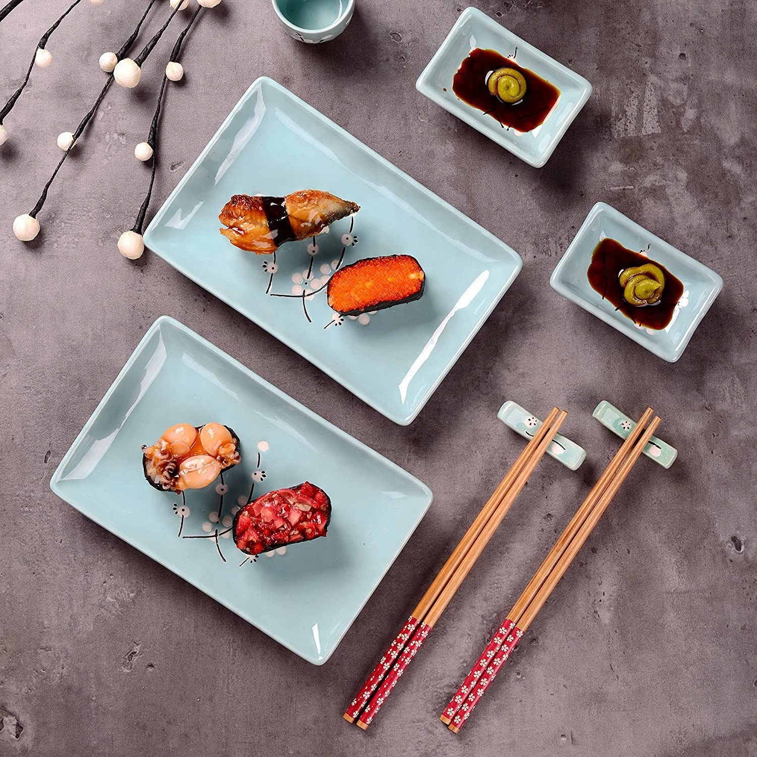 Набор тарелок для суши Panbado, 8 предметов, фарфоровые наборы для суши в японском стиле, подарочная коробка включает 2 тарелки для суши, 2 миски для погружения, 2 подставки для палочек для еды, 2 пары бамбуковых палочек для еды. Синий