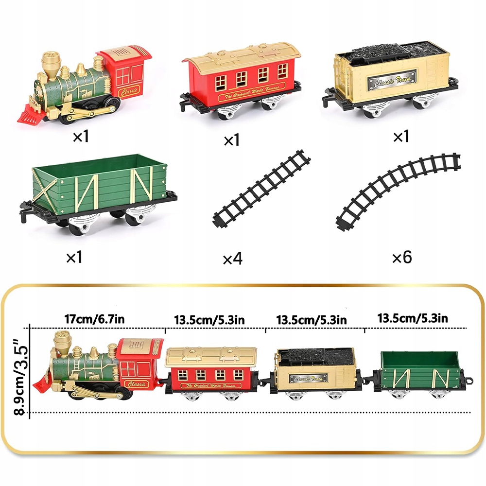 - 🚂 Набор включает в себя паровой локомотив, пассажирский автомобиль, карбоновый автомобиль, грузовой вагон, 6 изогнутых дорожек и 4 прямых дорожек, чтобы начать собственное приключение с рельса. Рождественские воспоминания с детьми.