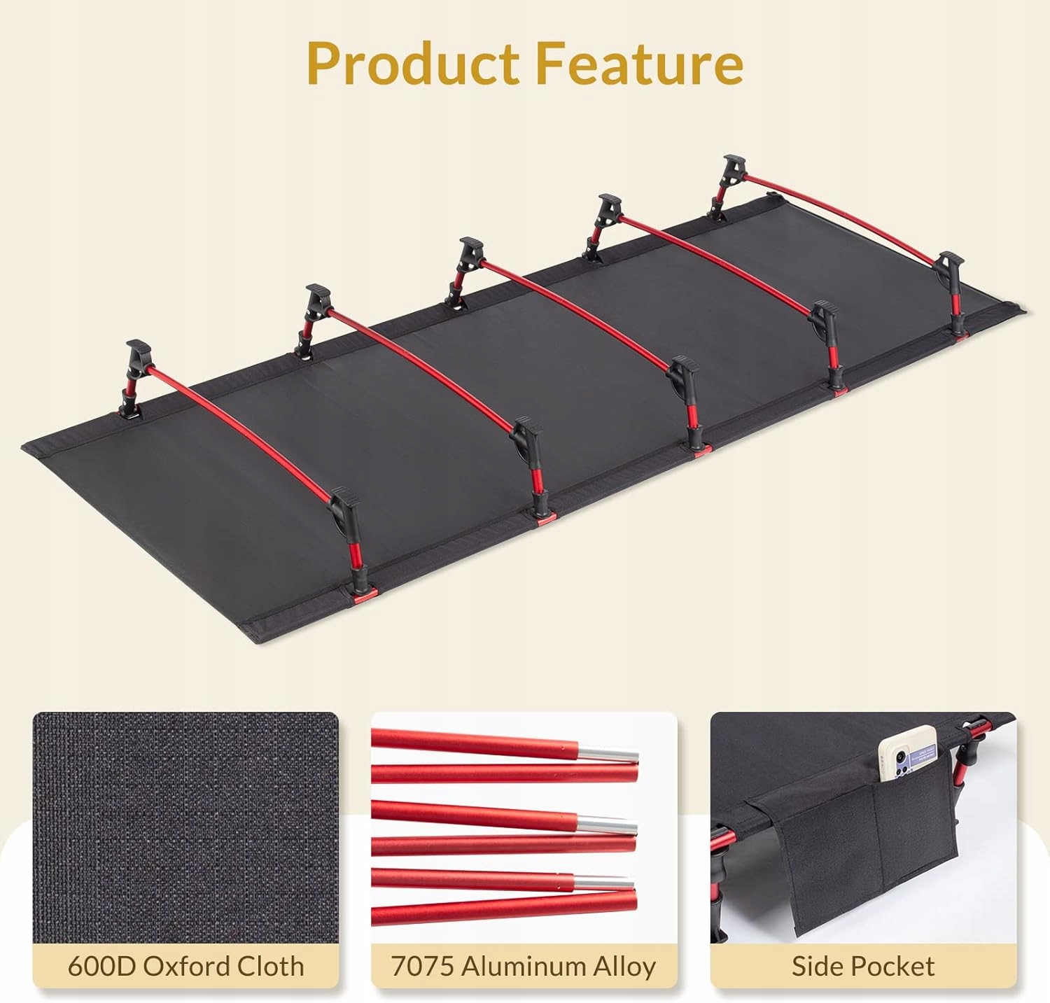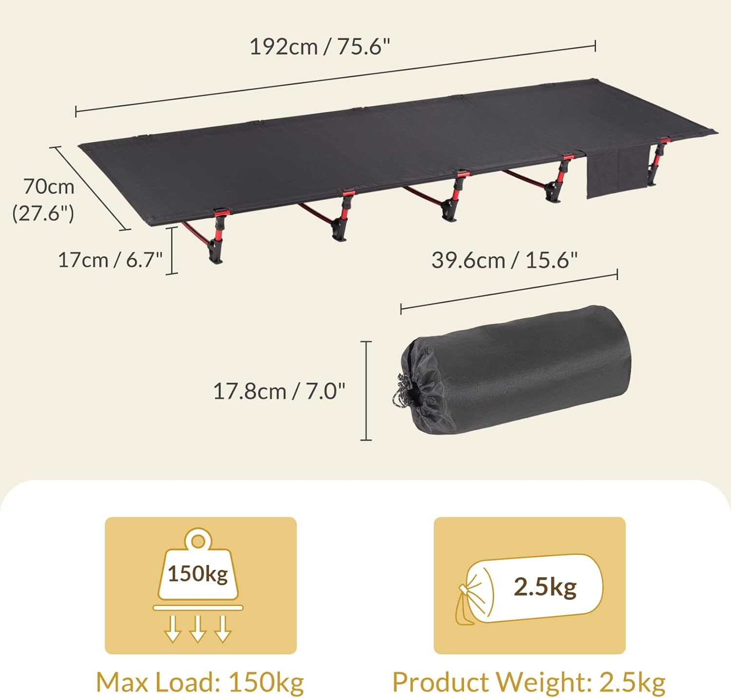 - Прочная и долговечная складная походная кровать изготовлена из дышащей ткани Оксфорд 600D, прочной и устойчивой к разрыву. Опорные перекладины из авиационного алюминия 7075 и треугольные ножки выдерживают нагрузку до 150 кг.
