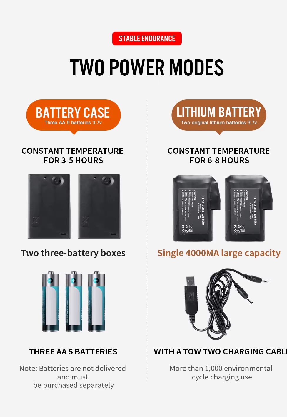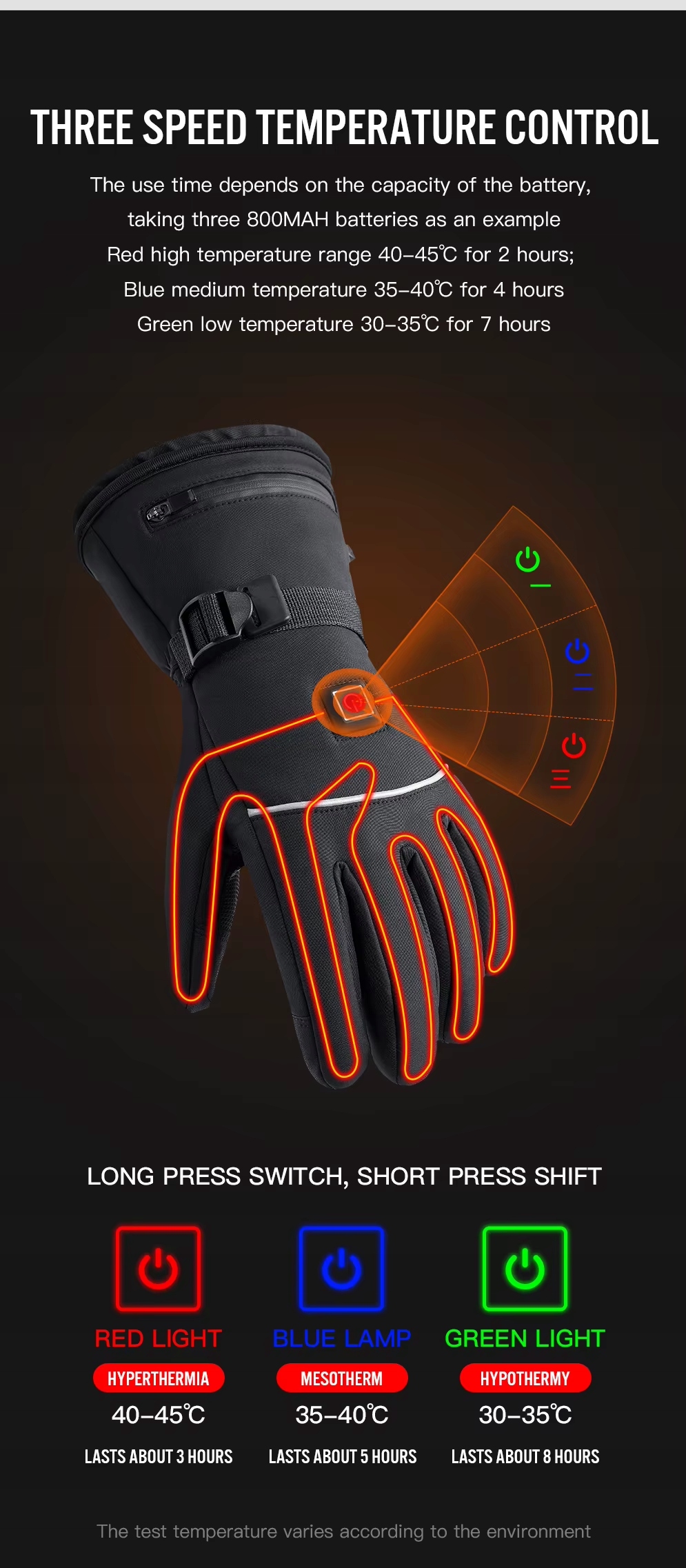 - ❄ Электрические перчатки с подогревом разработаны с помощью 3 регуляторов настроек для нагрева, чтобы легко отрегулировать температуру до ваших собственных потребностей, а также индикатором питания для отображения оставшейся батареи. Его можно использовать в течение примерно 3 часов с наибольшей температурой (150 ° F / 65 ° C), около 4 часов со средней настройкой температуры (131 ° F / 55 ° C), около 6 часов при настройке с самой низкой температурой (113 ° F / 45 ° C)!