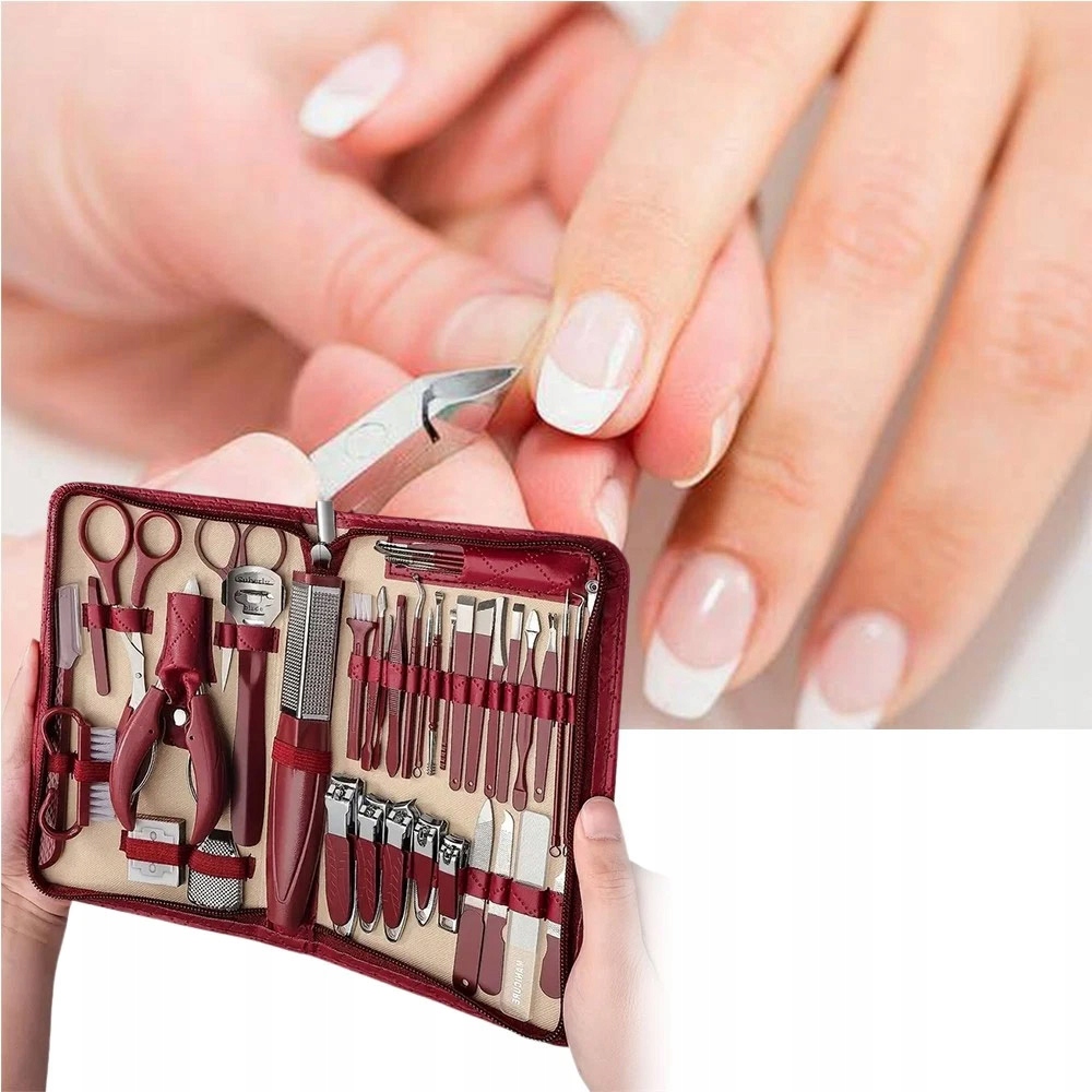Набор включает в себя педикюрные инструменты, в частности, плоскогубцы с широкими челюстями, которые облегчают точную работу с более сложными гвоздями, что делает уход за ногами. Типичные наборы маникюров, этот набор содержит дополнительные инструменты для очистки ушей и ухода за бровью, предлагая комплексную личную гигиену и решения для ухода.