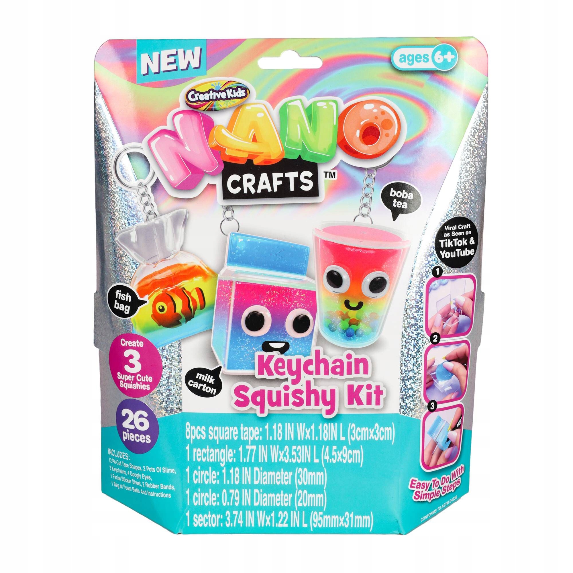 Возможности с Nano Tape безграничны, как и с мягким набором ключей Nano Crafts! Этот набор не требует нагревания или резки. В комплект входят предварительно вырезанные наноленты, слайм и брелоки. Создавайте умных личностей, добавляя причудливые глаза или мордочки с помощью прилагаемого листа наклеек. Дети в возрасте от 6 лет и старше могут использовать свое воображение и простые инструкции, чтобы создать мягкие игрушки Nano Crafts своего любимого цвета и попросить их прикрепить их к цепочке для ключей.
