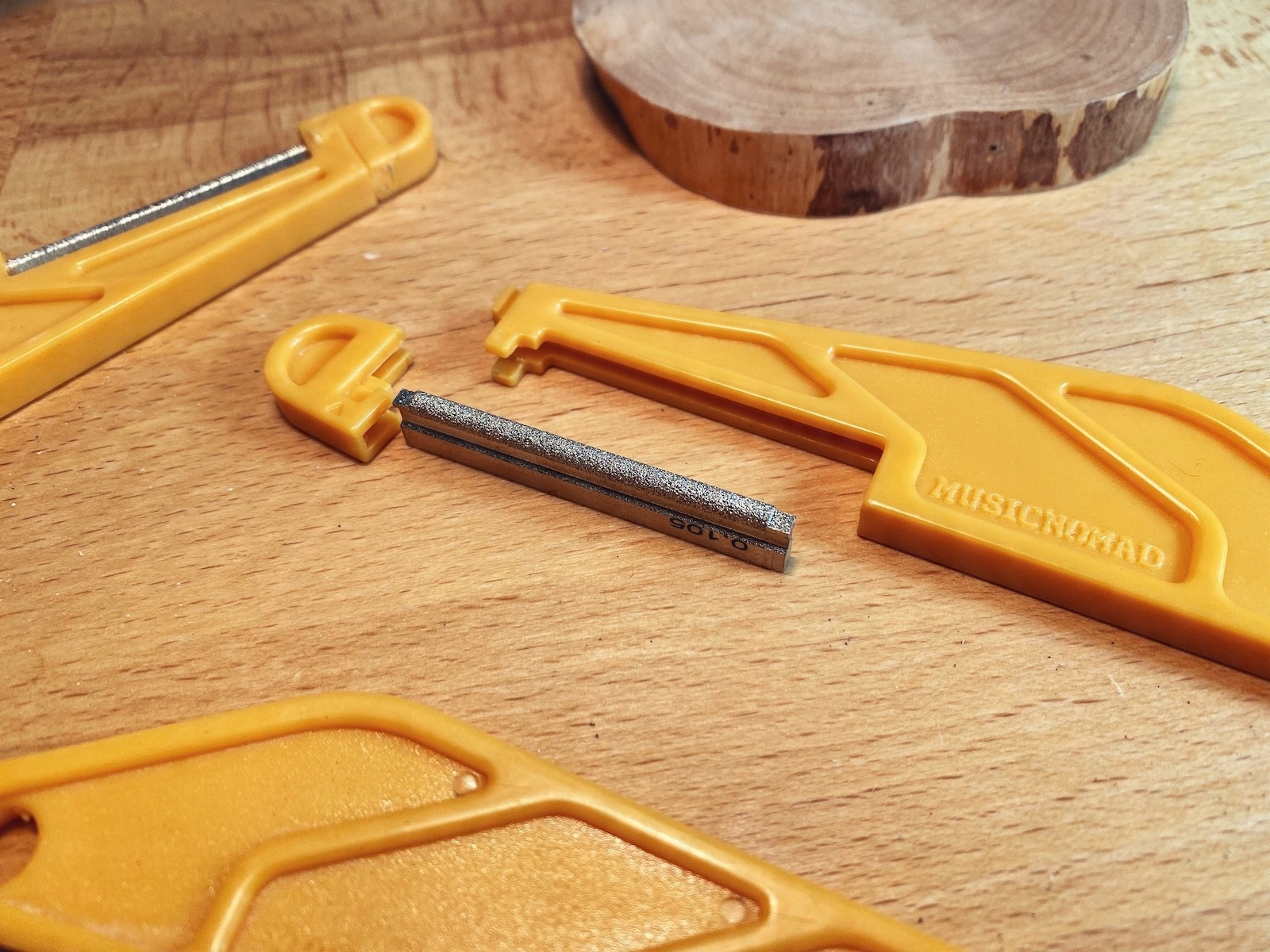Напильники с алмазным покрытием — еще один фантастический и продуманный инструмент от Music Nomad. Файл закруглен и повторяет форму струны. Его поверхность покрыта алмазной пылью, что делает напильник очень прочным, а полированную поверхность гладкой. Удобная ручка и соответствующий дизайн «лезвия» предотвращают изгиб напильника, обеспечивая ровные и точные срезы. Само лезвие при необходимости можно вынуть из держателя. Напильники подходят для большинства используемых седел – нейлоновых, костяных, графитовых или TUSQ®. Более того, они также подходят для седел бриджа.