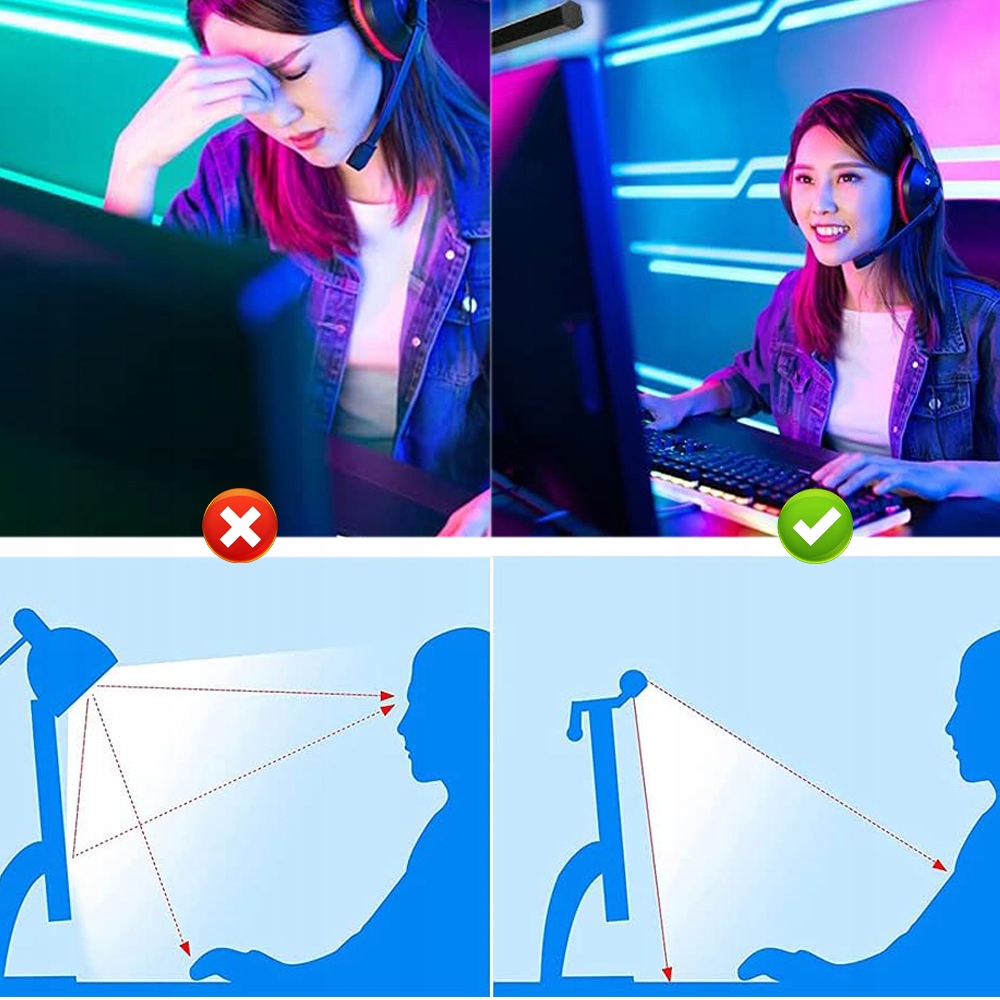 Наши световые полосы для компьютера имеют подсветку, которая эффективно устраняет вредный синий свет, который может повлиять на ваше зрение, уменьшает раздражение глаз и обеспечивает оптимальную защиту глаз.