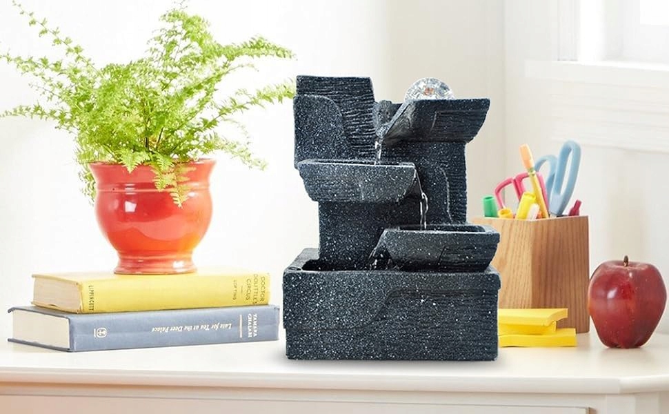 Фонтан воды-отличный способ диверсифицировать интерьер дома, офиса или внутреннего дворика. Небольшие водопады и освещенный хрустальный шарик оказывают расслабляющий эффект, обновляют воздух, уменьшает пыль, придавая разуму мир и стабильность.