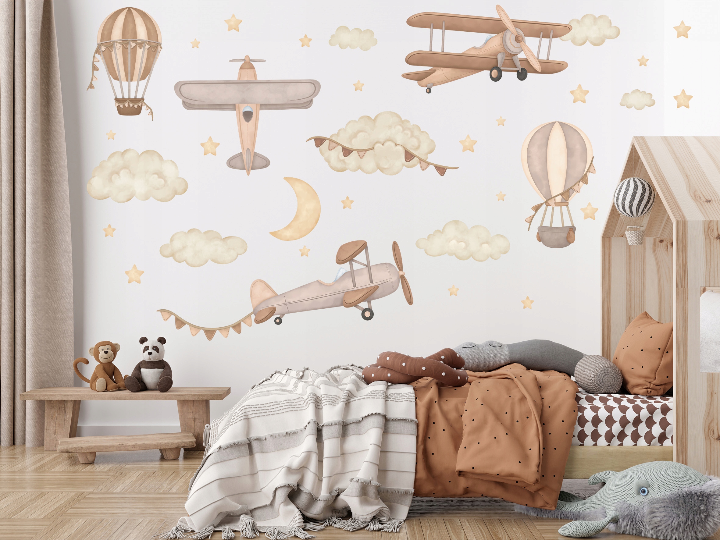 Очень большой набор настенных наклеек с самолетами и воздушными шарами в тонких оттенках коричневого и бежевого. Набор дополняется звездами, облаками и луной. Наши наклейки красиво украшат стены в комнате каждого мальчика.