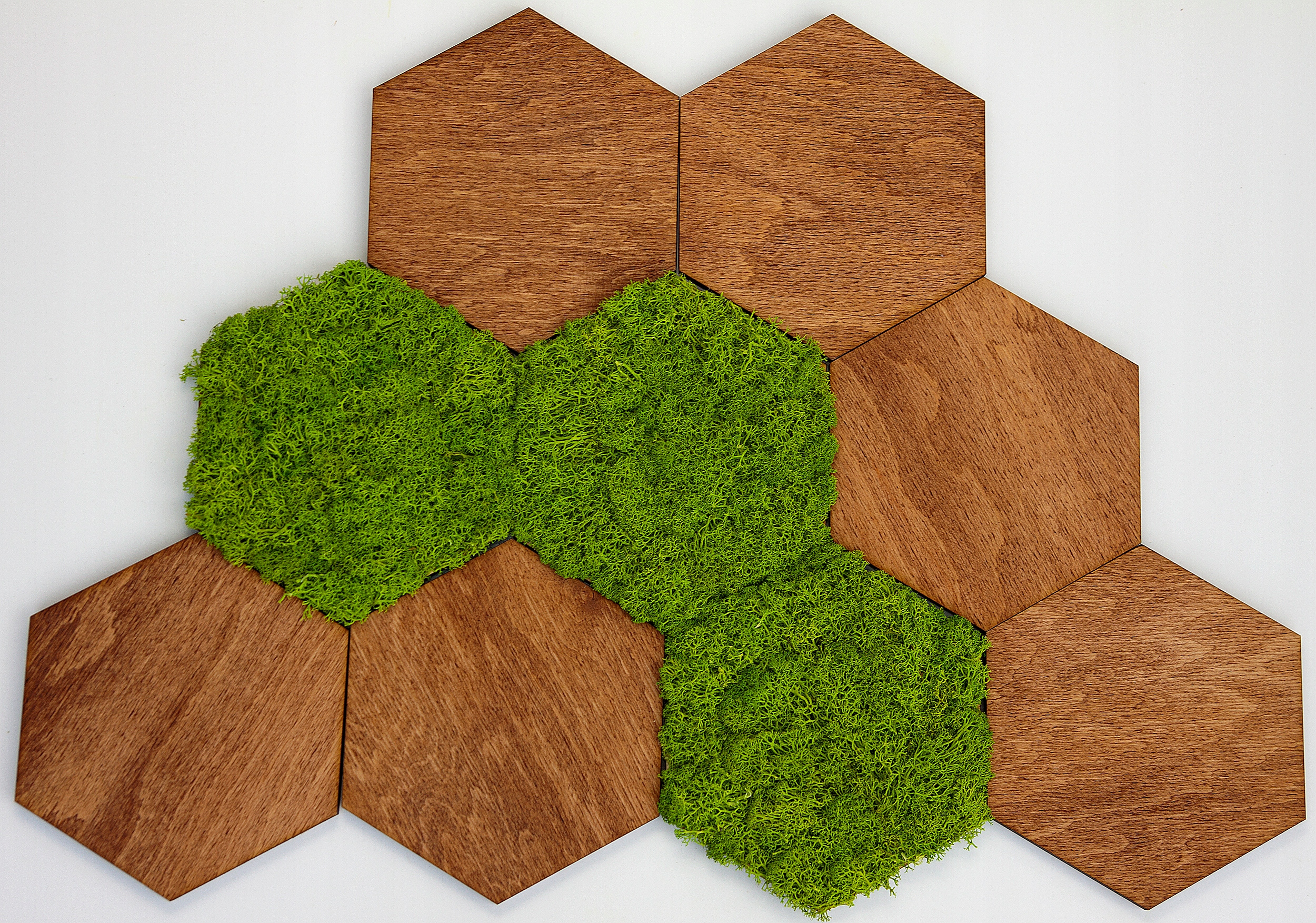 Комплект состоит из 9 деревянных шестиугольников, 3 из которых покрыты срезанным весенним зеленым мхом.