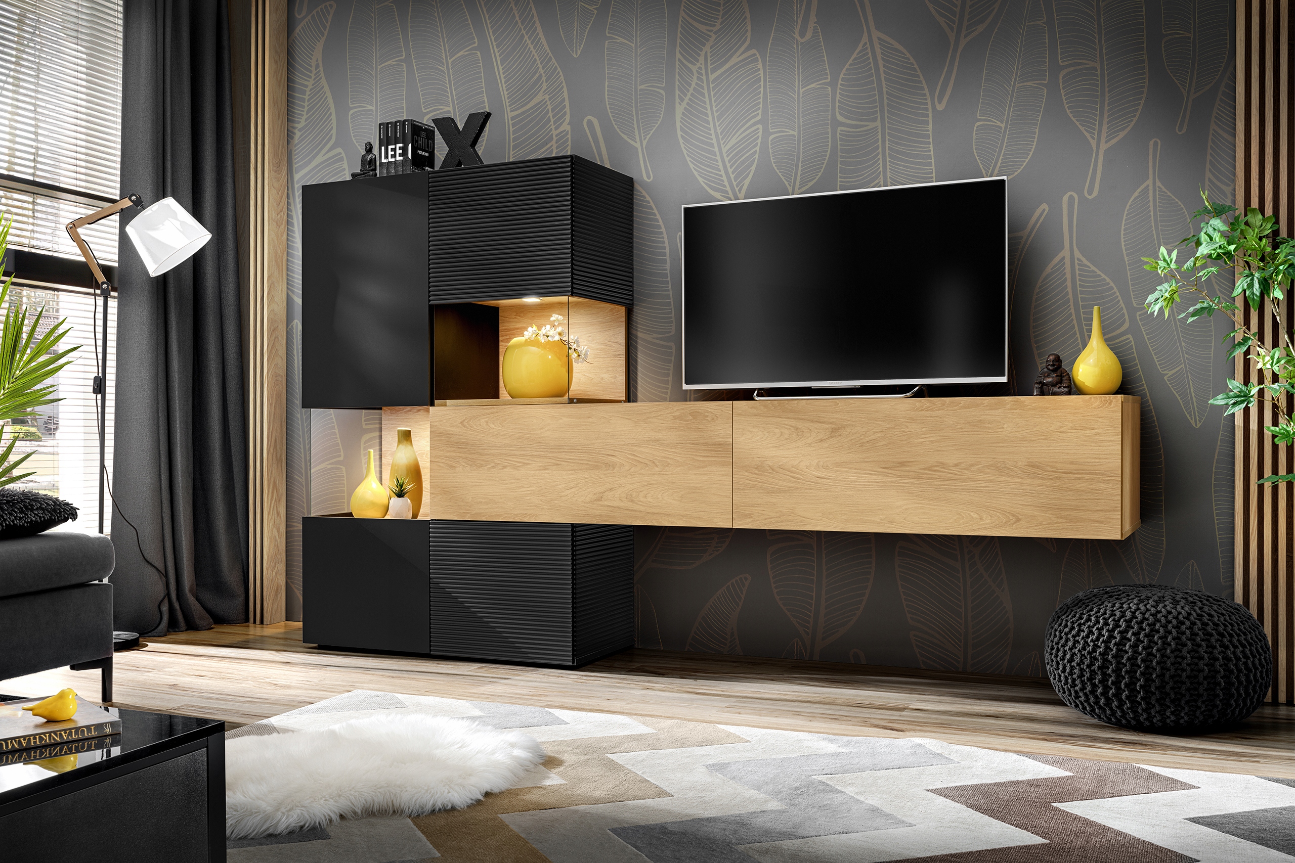 Flamelick Brick - это уникальный набор мебели, которая выделяется с современным дизайном и тщательно отобранными материалами, что дает ему элегантный характер. Этот продукт хранится в цвете черного матового, который гармонично гармонирует с натуральным декором из дерева Хикоры, создавая впечатляющую комбинацию.