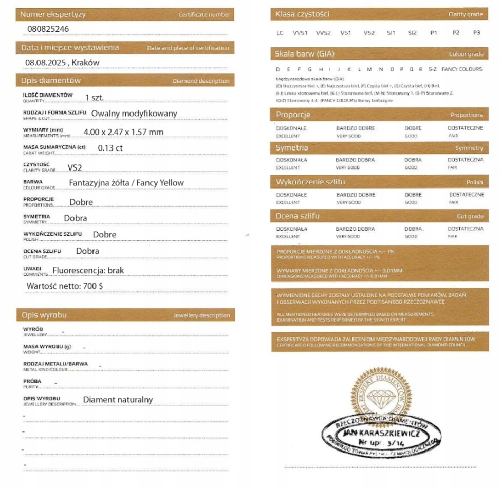 Алмаз прикреплен к сертификату оценщика Польского геммологического общества, компании Diamond Sky, работающей в течение 30 лет на фотографиях Plock Market + Catalog с QR. Алмазы и действуют в качестве генерального секретаря польского геммологического общества.