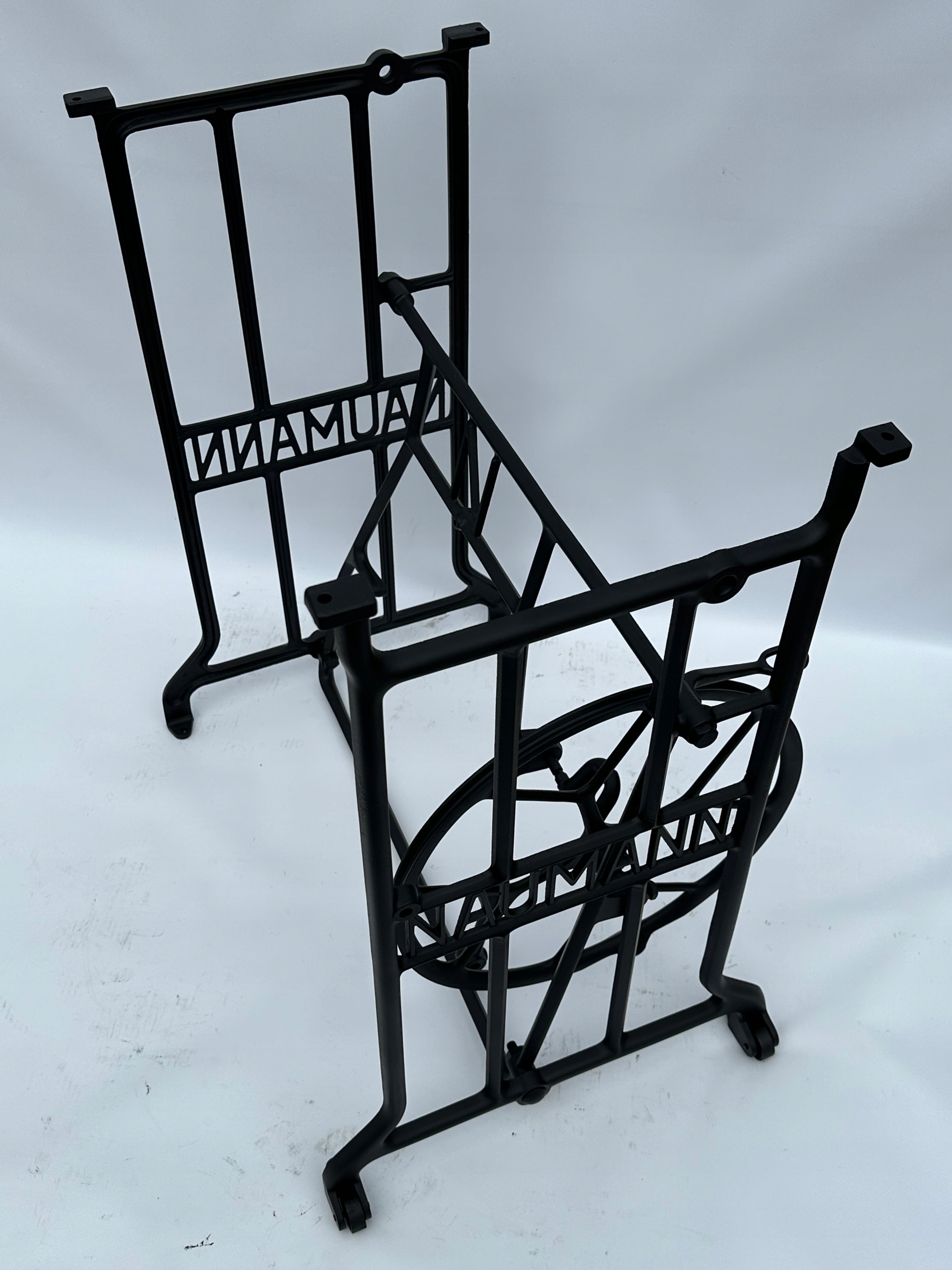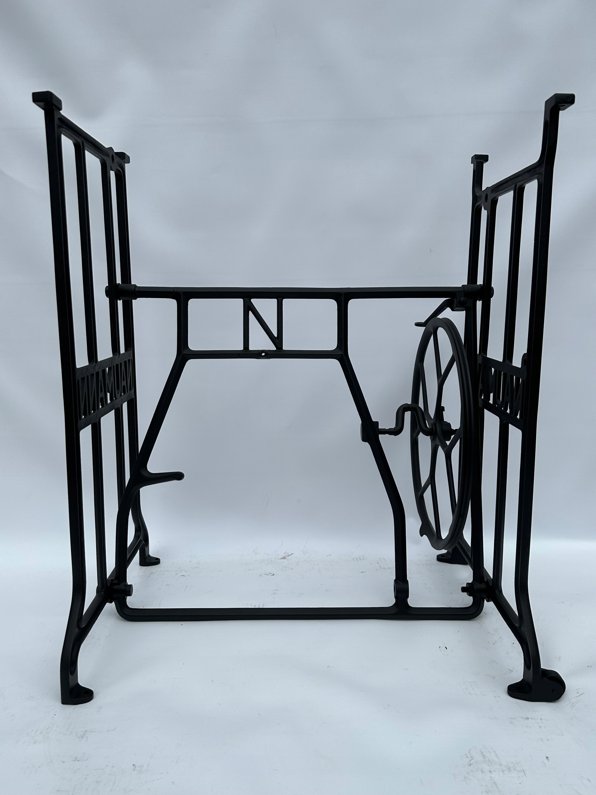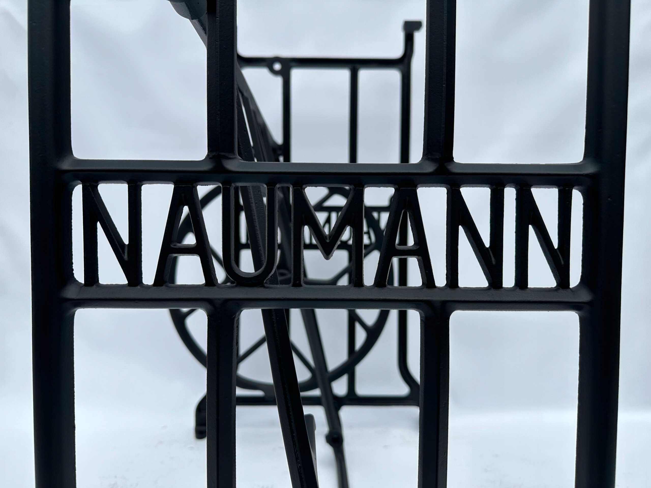 Предмет продажи — старая чугунная основа от швейной машины NAUMANN. Очень красивый узор. Надписи с логотипом компании по бокам. Оба колеса находятся внизу.