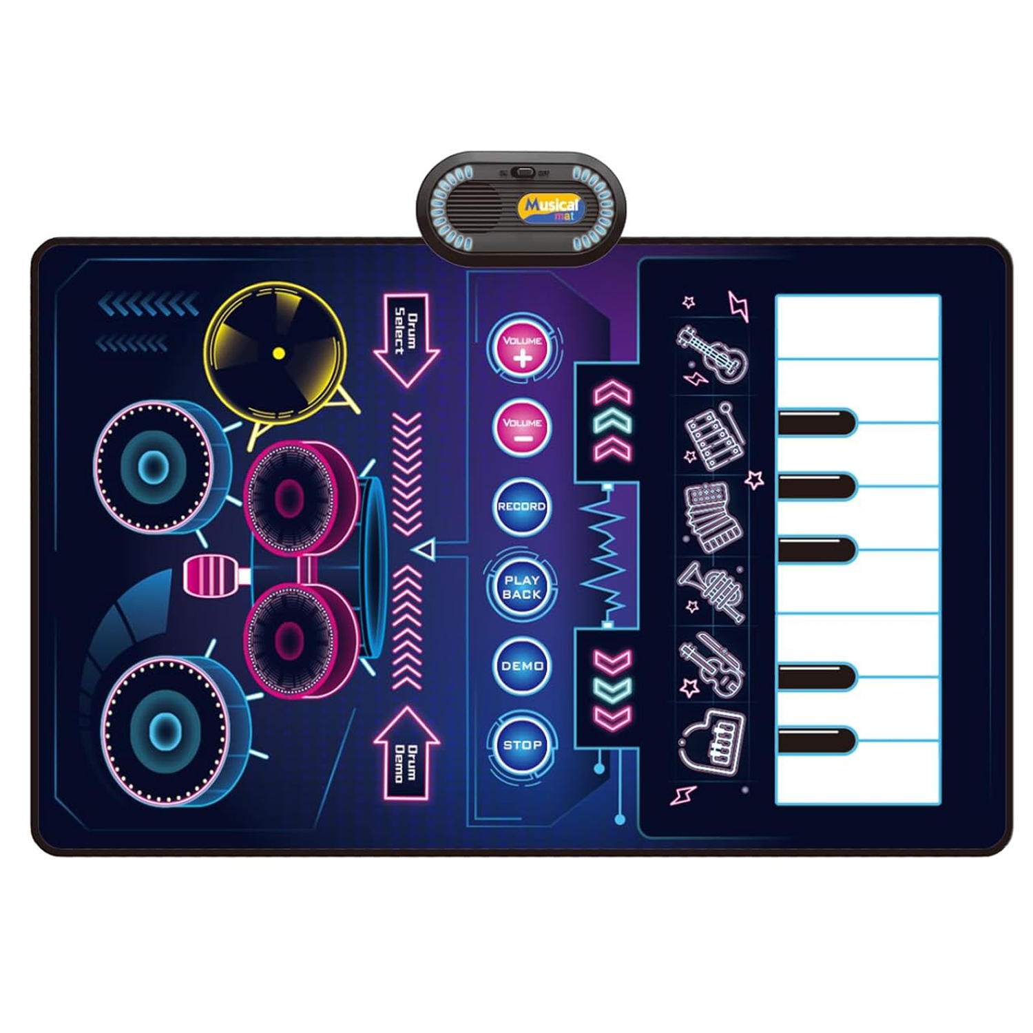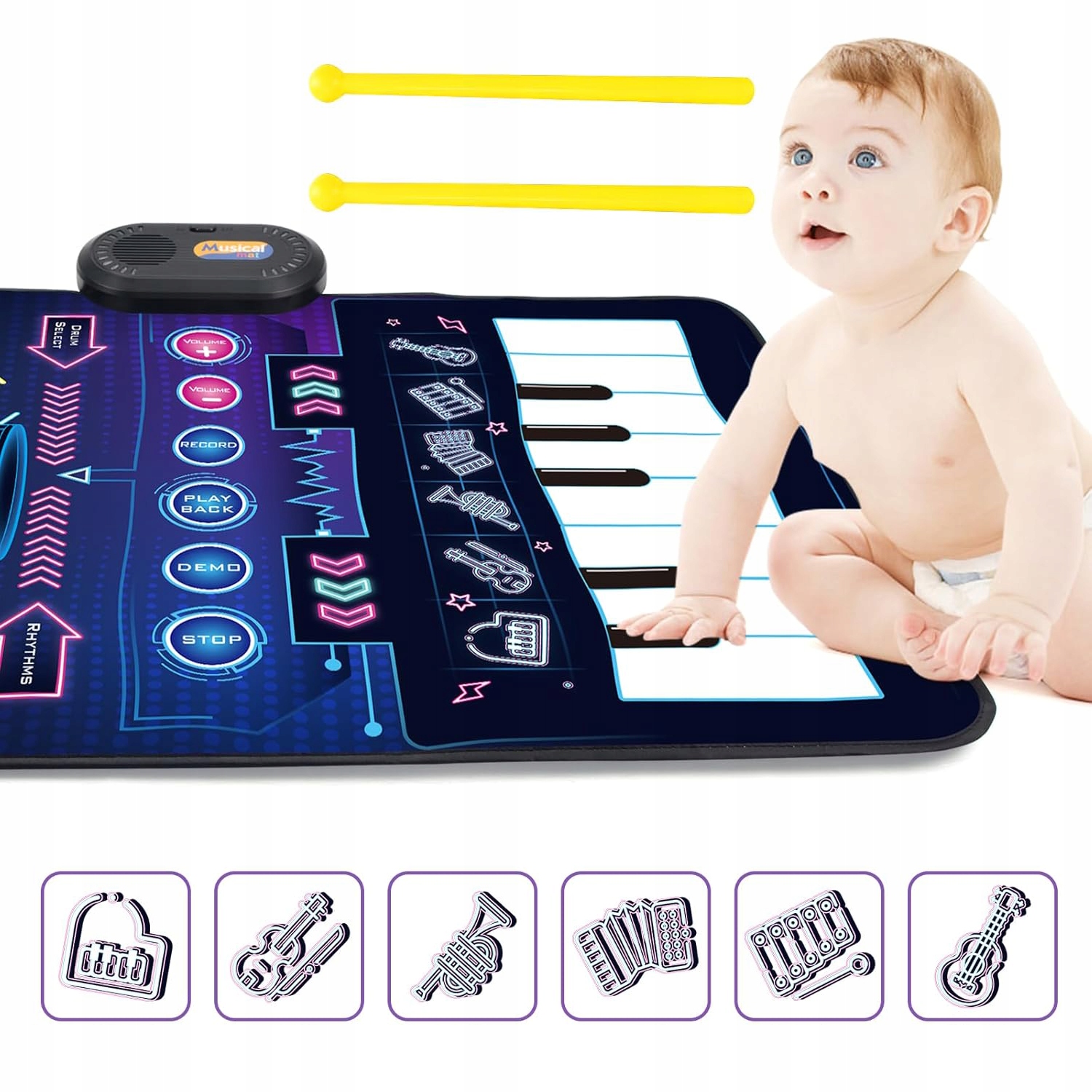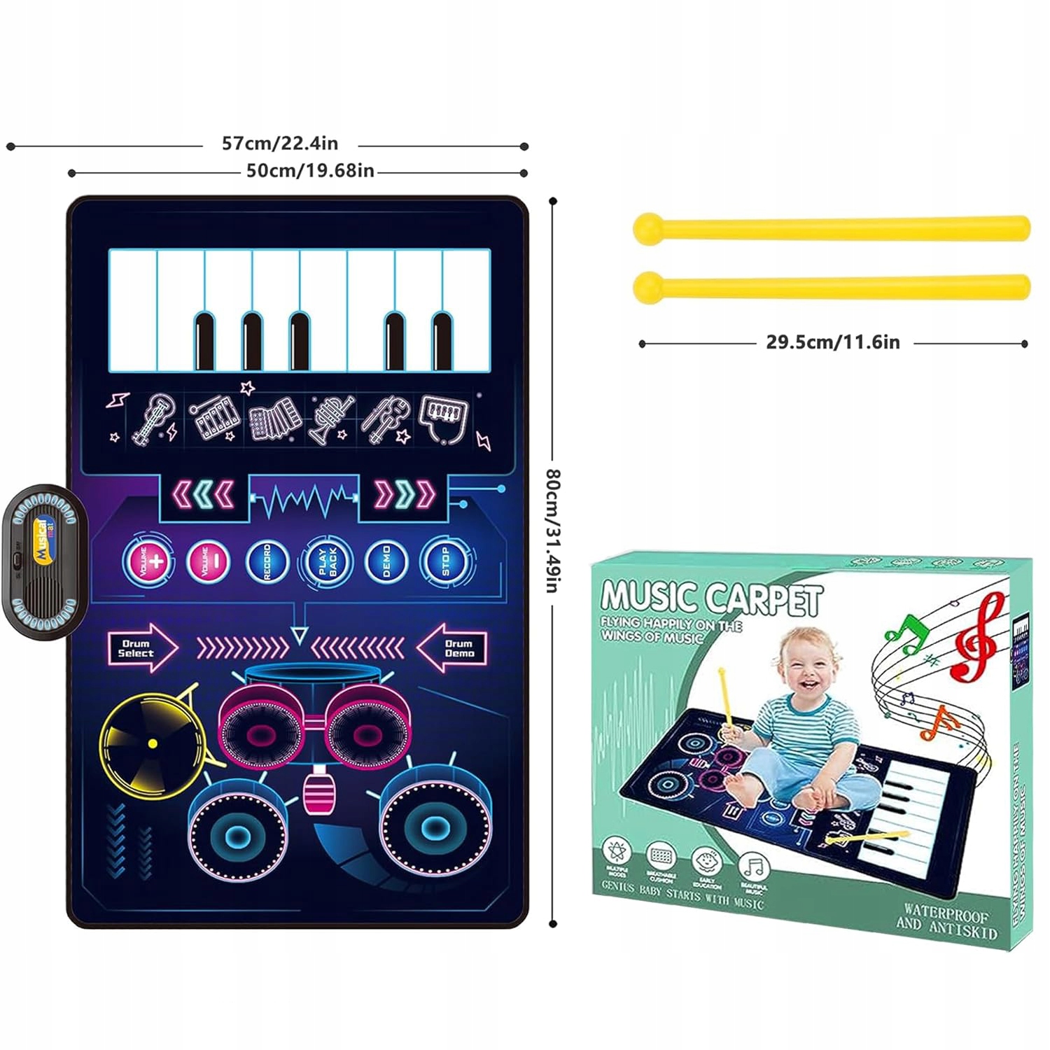 - Существует много звуков инструментов (пианино, скрипка, труба, аккордеон, гитара), а также 8 пианино -клавиш на стороне пианино и 2 палки на барабанной стороне, которые позволяют вам наслаждаться игрой в сет на барабанах. Наш музыкальный коврик имеет встроенную функцию игры в песню, благодаря которой дети могут играть, изучая и составляя множество различных музыкальных стилей.