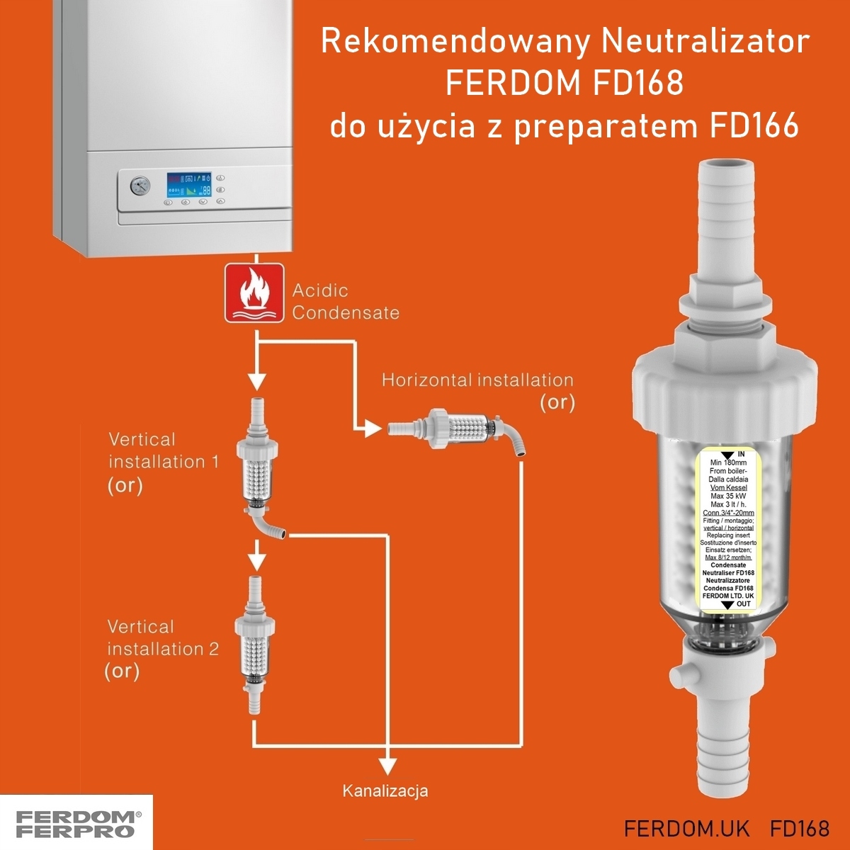 Средний бытовой конденсационный котел может производить 800 литров кислоты в год при pH около 4,0, что в сумме составляет миллионы литров. кислоты, сброшенной по всей стране. В настоящее время руководящие принципы во многих странах требуют, чтобы сточные воды сбрасывались в городскую канализацию и водотоки с pH от 6,5 до 10,0. Поэтому рекомендуется нейтрализовать его (чтобы избежать загрязнения и коррозии материалов), а наша смесь нейтральных материалов работает за счет повышения значения pH. Использование нейтрализатора FD168 превращает кислый конденсат в нейтральную, безвредную систему.