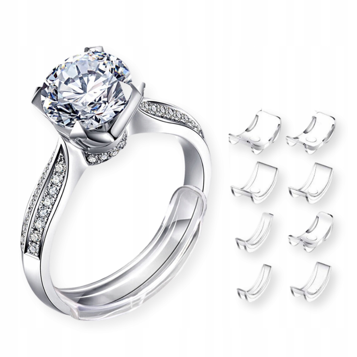 - Благодаря гибкому пластику регулятор уверенно удерживает кольцо на месте, устраняя риск его скольжения. Материал, который не раздражает кожу и не повреждает украшения.