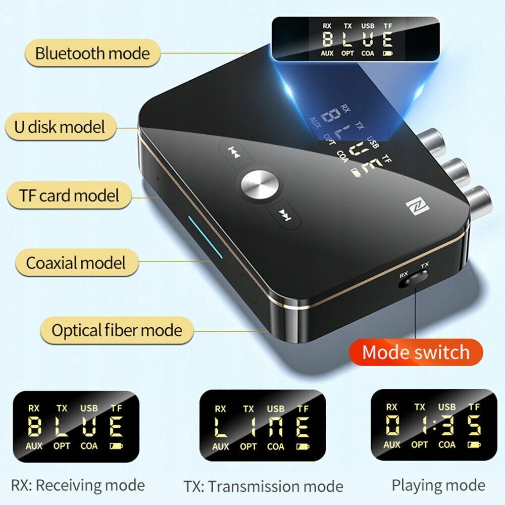 [адаптер Bluetooth 2 в 1]: поддерживает приемник Bluetooth (RX), передатчик Bluetooth (TX). Оснащены светодиодным дисплеем HD, статусом работы и режимом Bluetooth, четко видны. Благодаря многофункциональным кнопкам, режим переключения с одним ключом или воспроизведением/подвесной музыкой, легкой операции