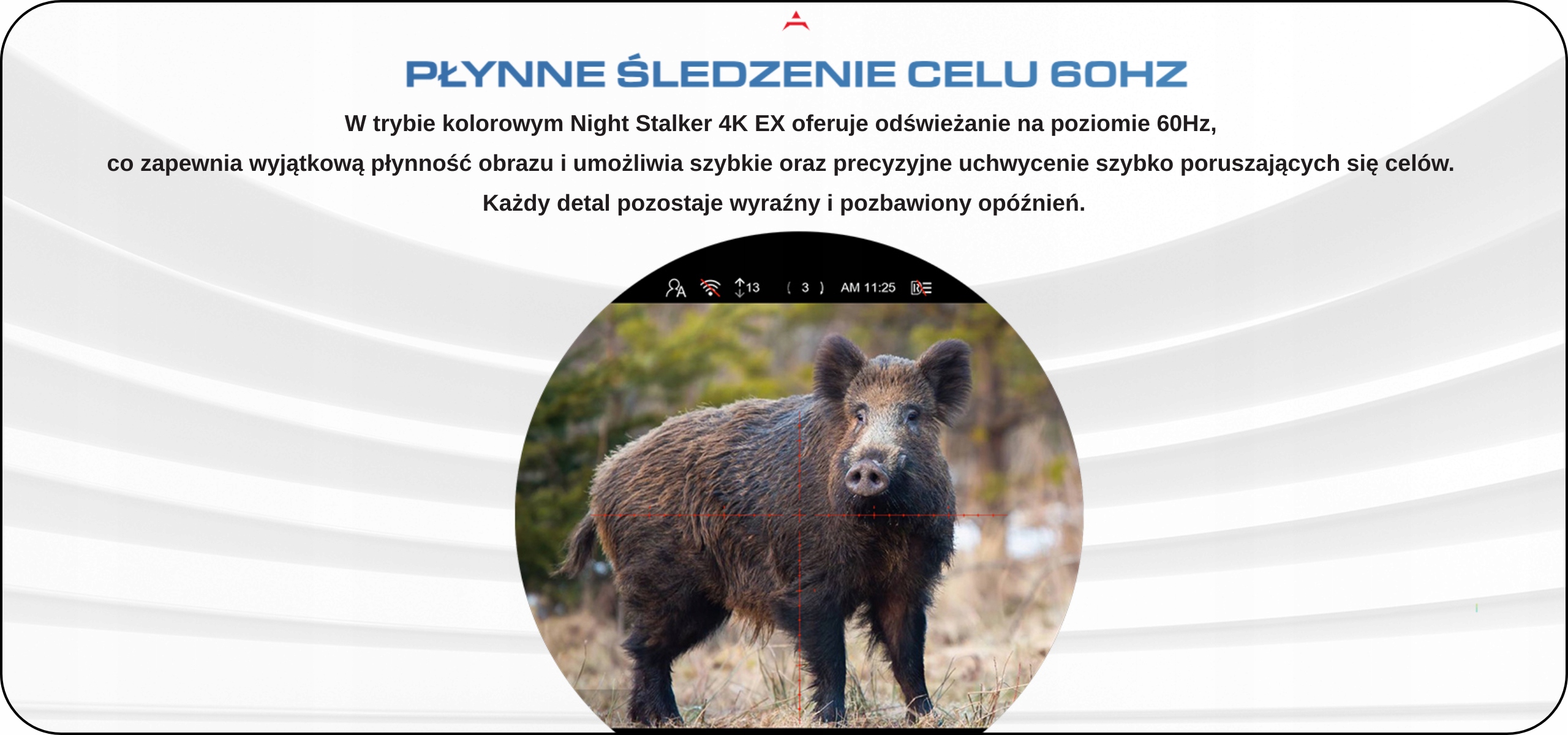 При охоте, каждую секунду и каждую деталь учитывается. Вот почему Night Stalker 4K Ex был оснащен цветной режимом с освежающим 60 Гц , что гарантирует необычайную плавность изображения. Даже быстро движущаяся игра остается ясной, без эффекта размазывания или задержек.