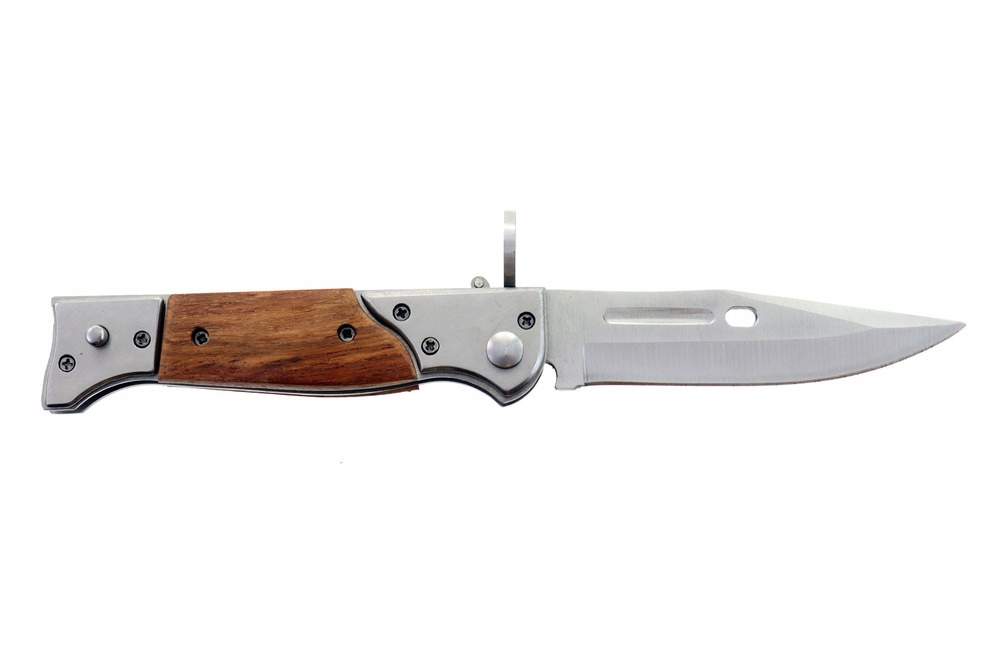 Нож изготовлен из нержавеющей стали, ручки деревянные. Штык открывается с помощью кнопки на левой стороне ножа и имеет фиксатор, предотвращающий случайное открытие или закрытие.