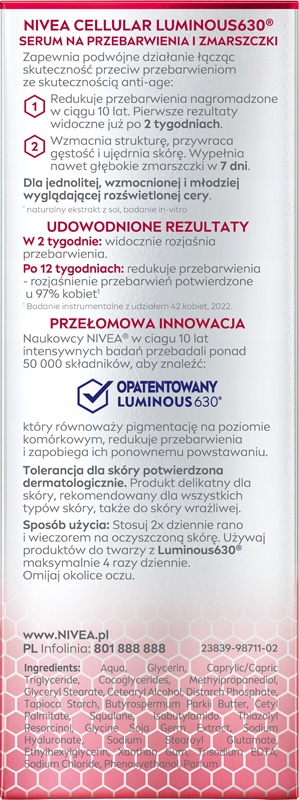 Обеспечивает двойное действие, сочетая эффективность против обесцвечивания и против старения. Уменьшает обесцвечивание, накопленное за 10 лет. Первые результаты видны через 2 недели. Укрепляет структуру, восстанавливает плотность и укрепляет кожу. Заполняет даже глубокие морщины за 7 дней. Для равномерного, укрепленного и помолодевшего сияющего цвета лица. Через 2 недели: заметно осветляет пигментные пятна. Через 12 недель: уменьшает пигментацию – осветление пигментации подтверждено у 97% женщин*. Ученые NIVEA за 10 лет интенсивных исследований изучили более 50 000 ингредиентов и нашли LUMINOUS630, который балансирует пигментацию на клеточном уровне, уменьшает обесцвечивание и предотвращает его повторное появление. Доверьтесь качеству NIVEA!