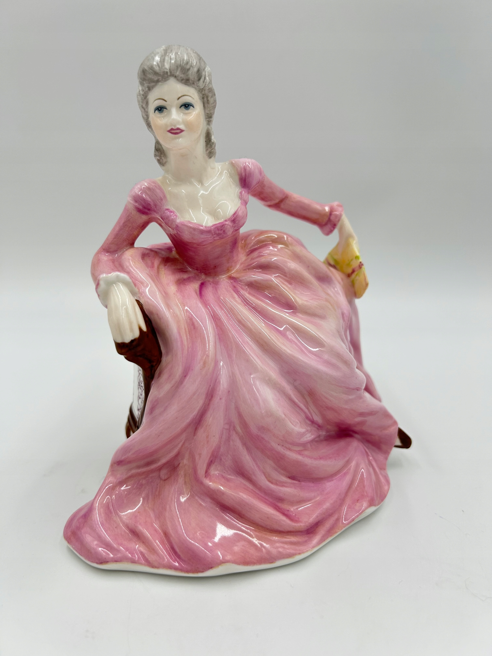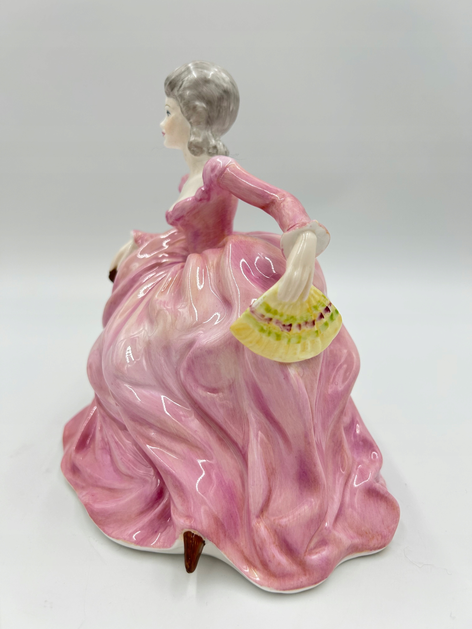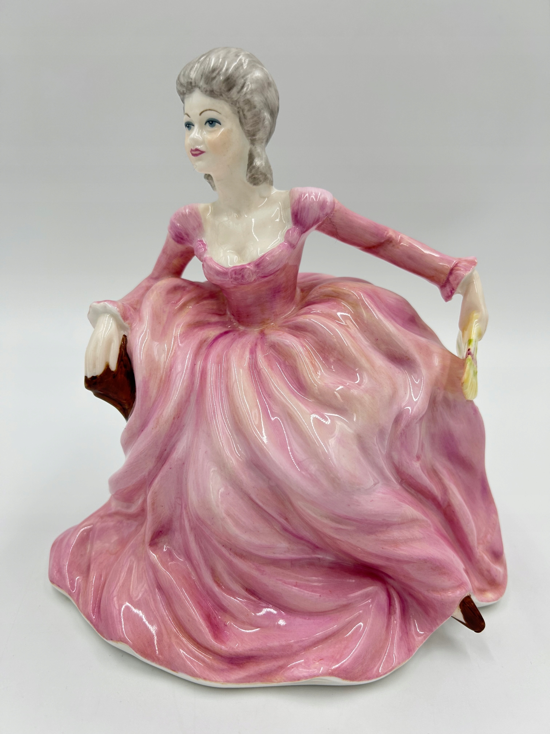 Представляю вам красивую статуэтку фабрики COALPORT из коллекции LADIES OF FASHION - Полли, изображающую очаровательную даму в длинном розовом платье, держащую в руке желтый веер.