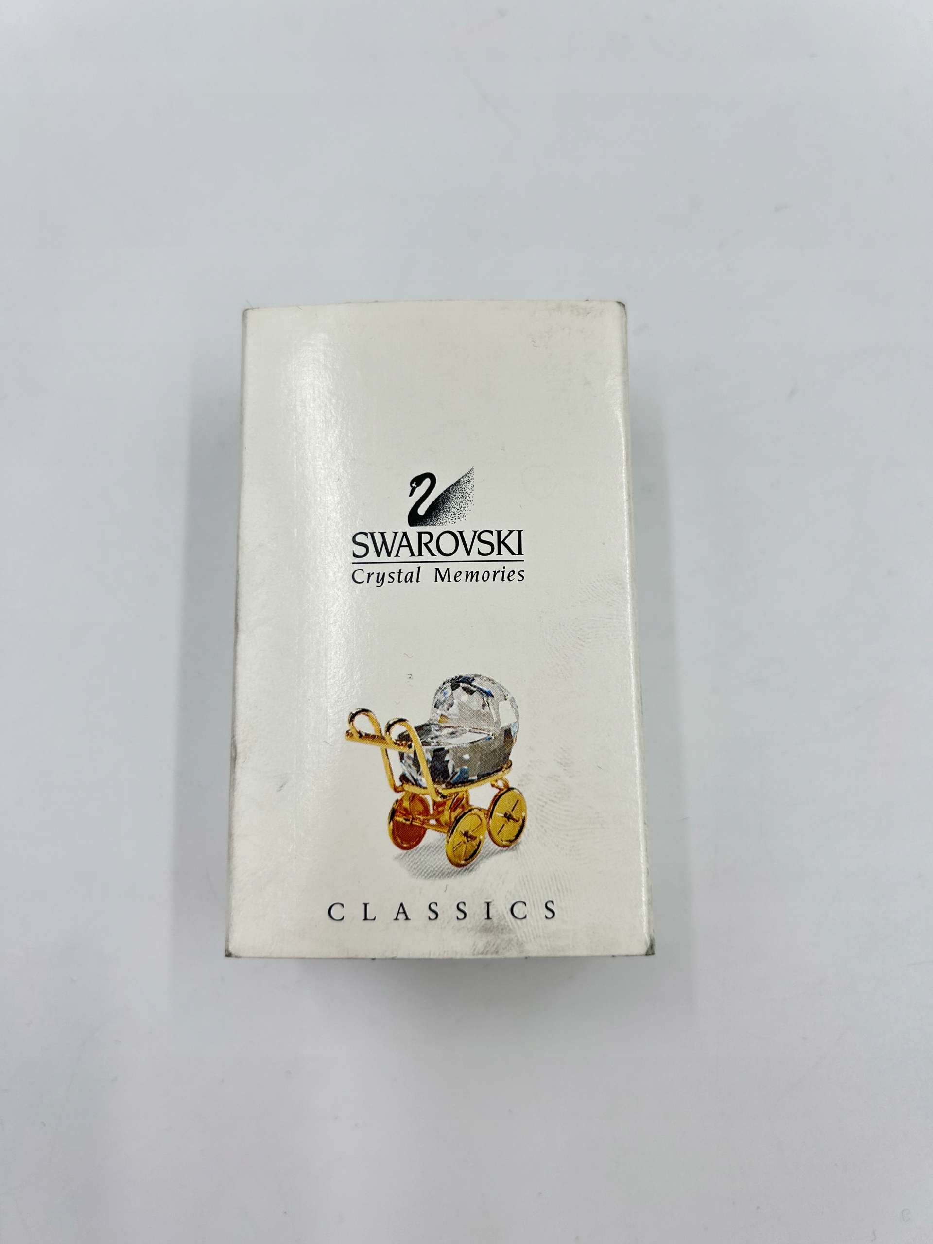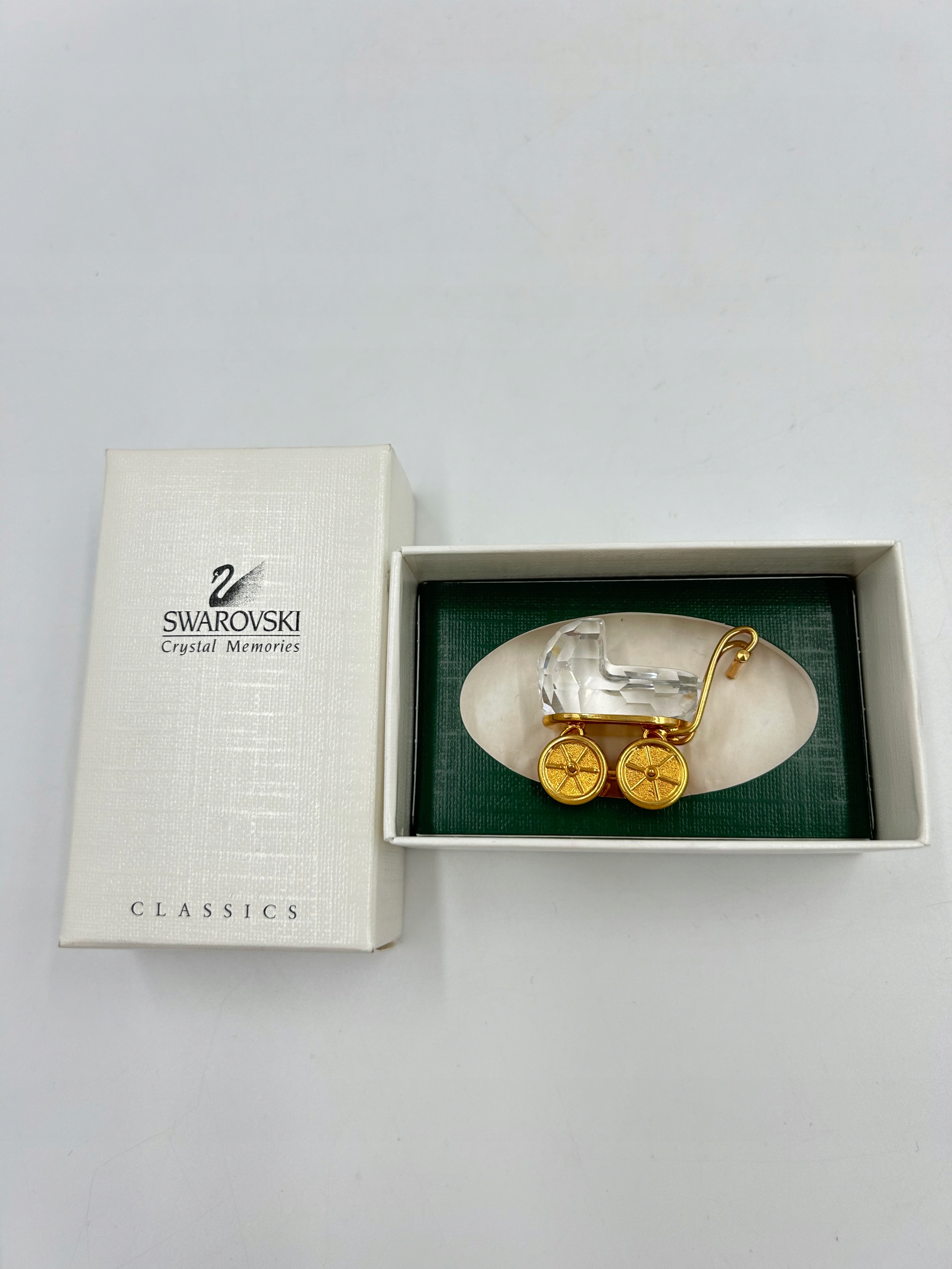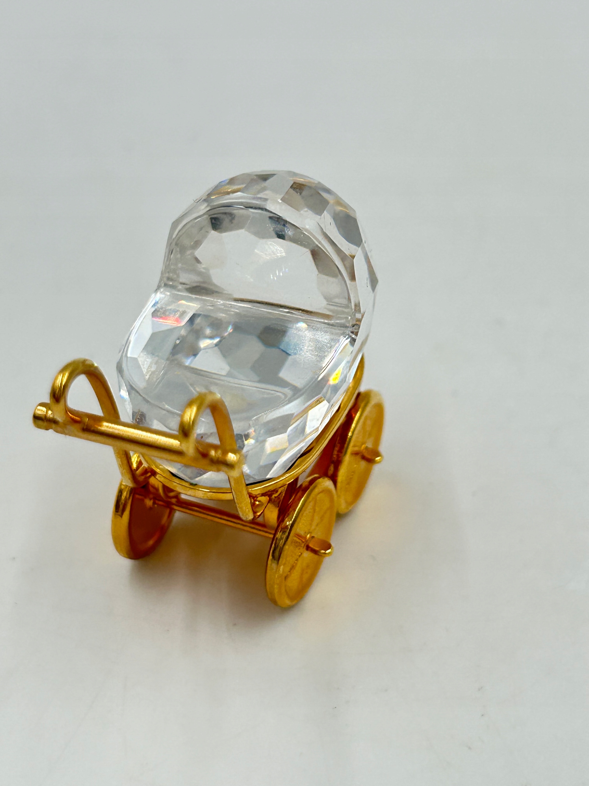 Предмет продажи — очаровательная хрустальная статуэтка, изображающая детскую коляску на золотых колесах. Кристалл переливается и красиво отражает свет, колесики вращаются. Производитель - Сваровски. Рекомендую в качестве подарка близкому человеку. Состояние видно на фото.