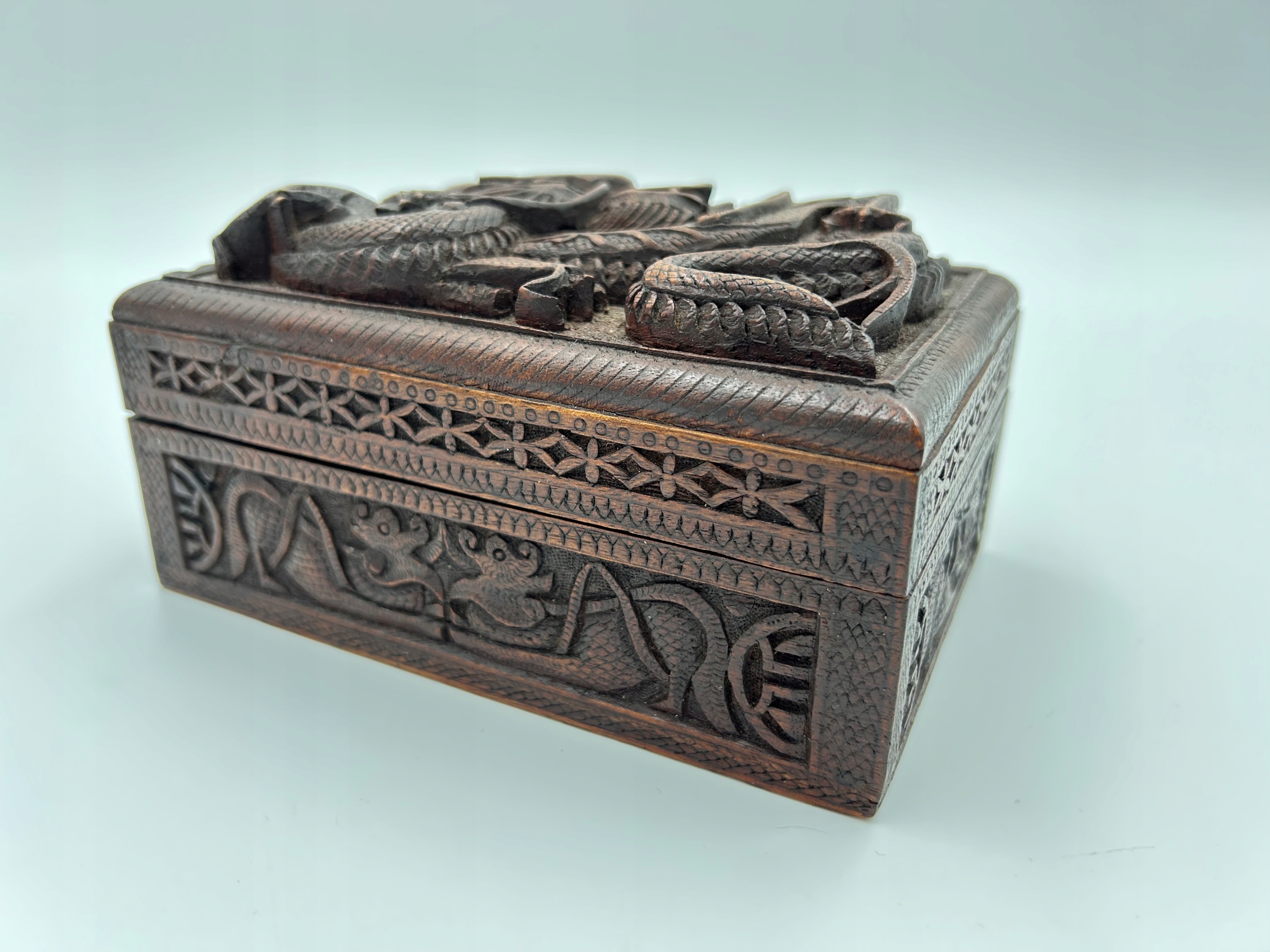 Представляю вам уникальную, старинную китайскую шкатулку из дерева, крышку которой украшает скульптура дракона. Изготовленный с большим вниманием к деталям и деталям, он привлекает внимание своим внешним видом. Красивое декоративное изделие, жемчужина для коллекционера.