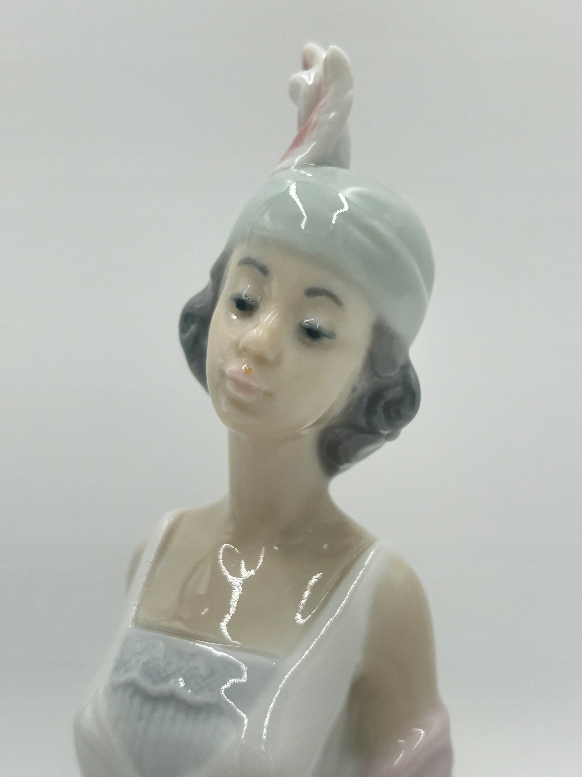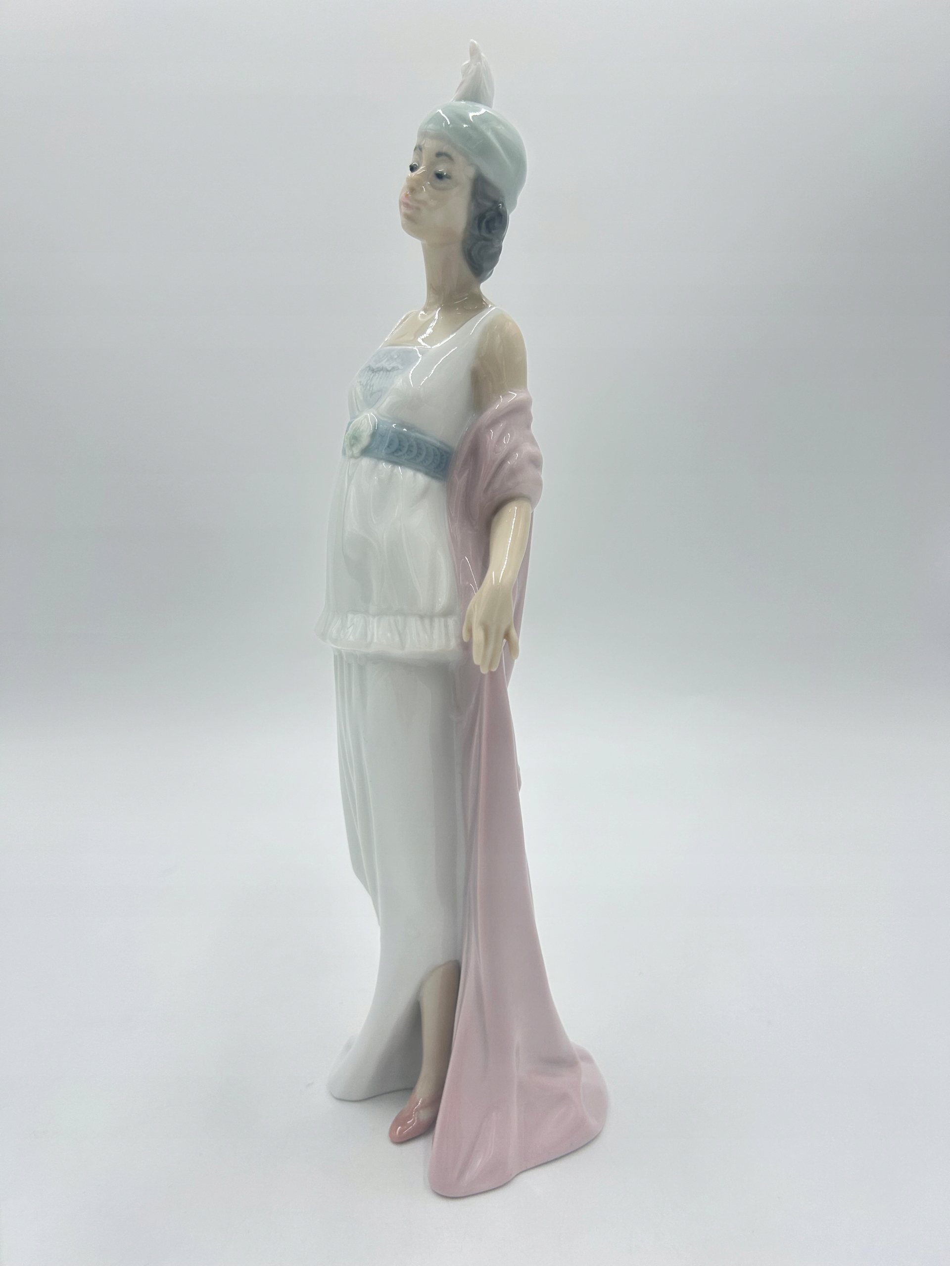 Я представляю вам уникальную фигуру испанского Lladrój Manufaktura Lladró, изображающая молодую женщину в элегантном стиле моды в стиле 1920 -х годов. Статуэтка, сделанная из высококачественного фарфора, раскрашенная вручную.